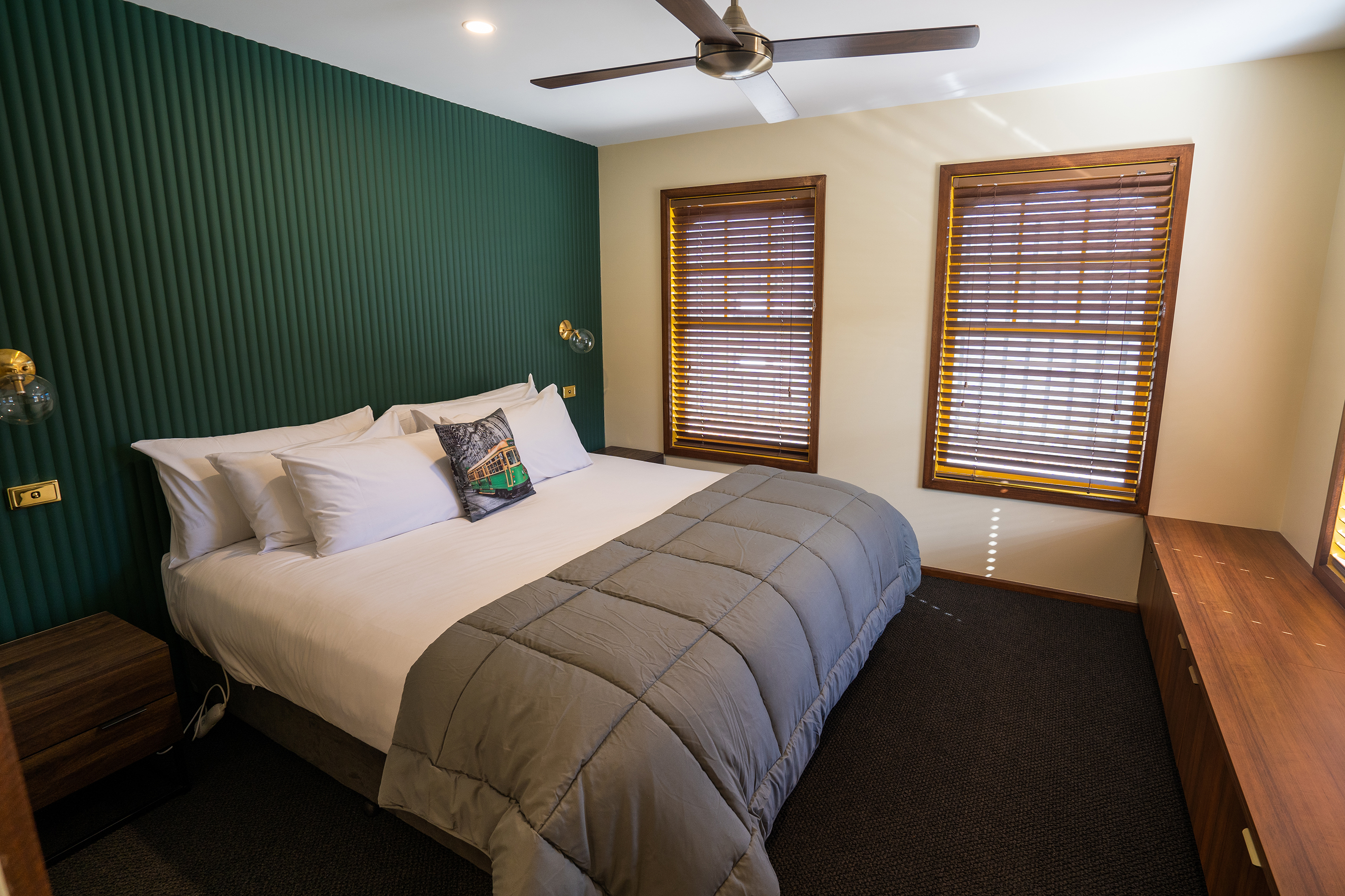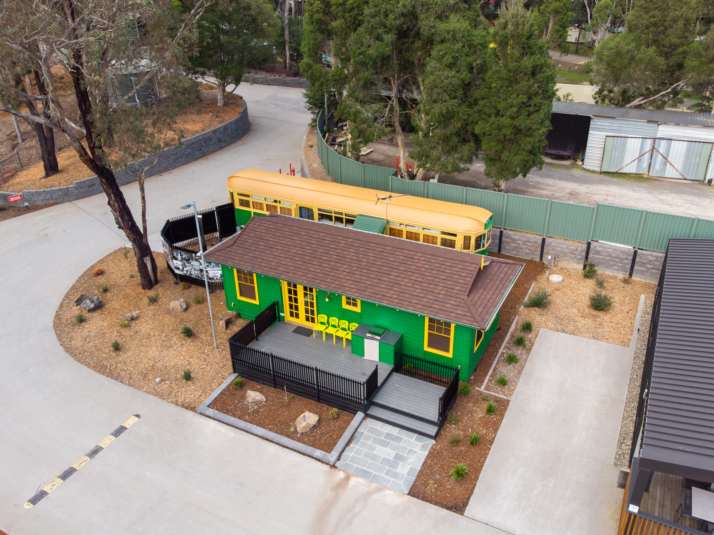 Tram 833 has 3 x bedrooms: 1 double bed, 1 king size bed and 2 sets of bunks, the top bunk is custom sized with limited weight capacity (suited for children 10 years and under). The tram features 3 bathrooms, 4 toilets, a washing machine and dryer, gas BBQ with outdoor furniture and a hot tub area.Tram 833 is better suited to older kids or mature aged groups and is located near caravan and tent sites, overlooking bushland.
