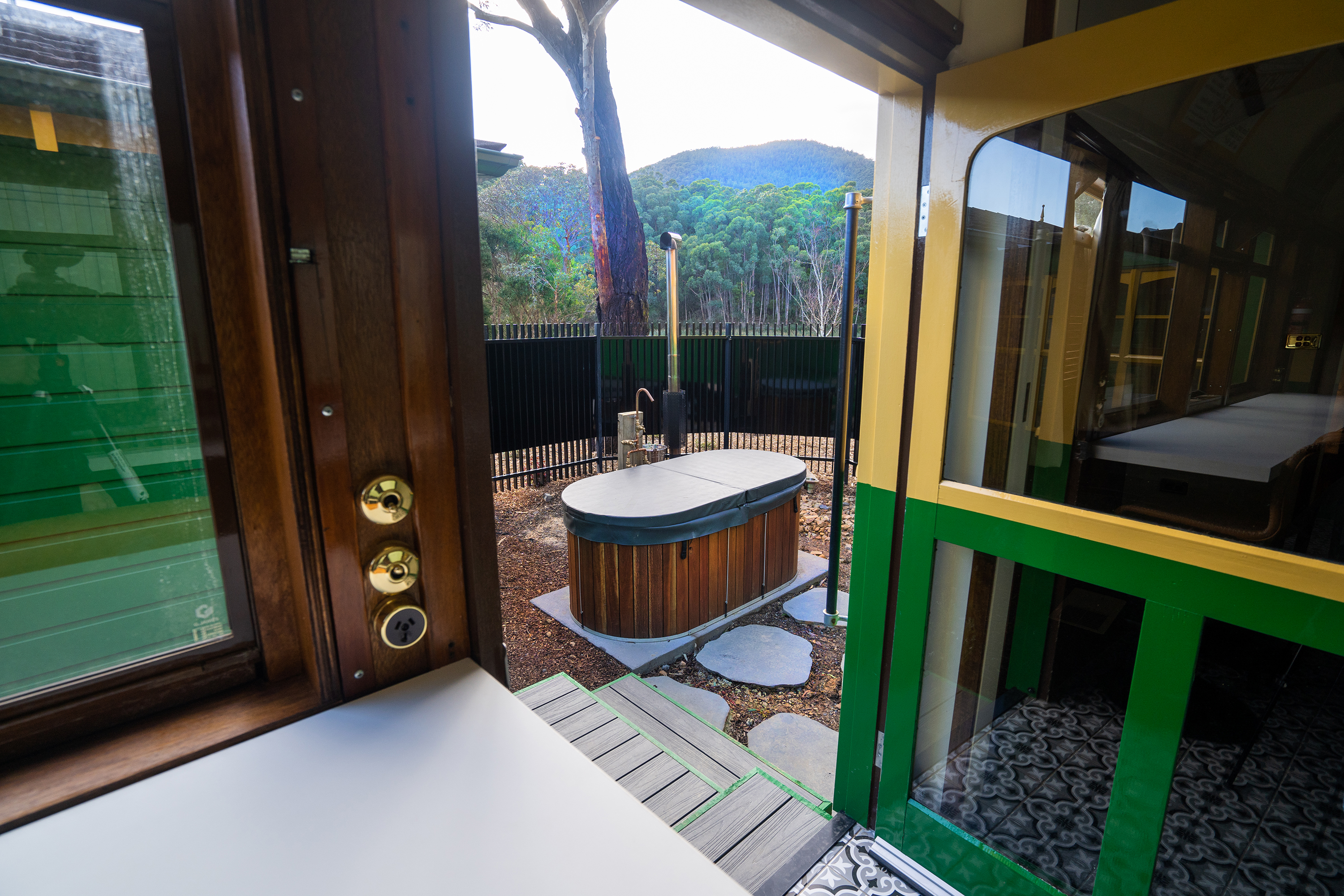 Perfect for families or a large group of friends, these old rattling beauties are full of surprises! Amongst the features, you'll find three bedrooms (sleeping 8 people - a king, a double and 2 bunks - each with its own ensuite), a full kitchen, lounge with 75" TV, European laundry, deck with BBQ, private outdoor wood fired hot tub, views of the Yarra Ranges and all the amazing facilities that come with staying a world class holiday park.