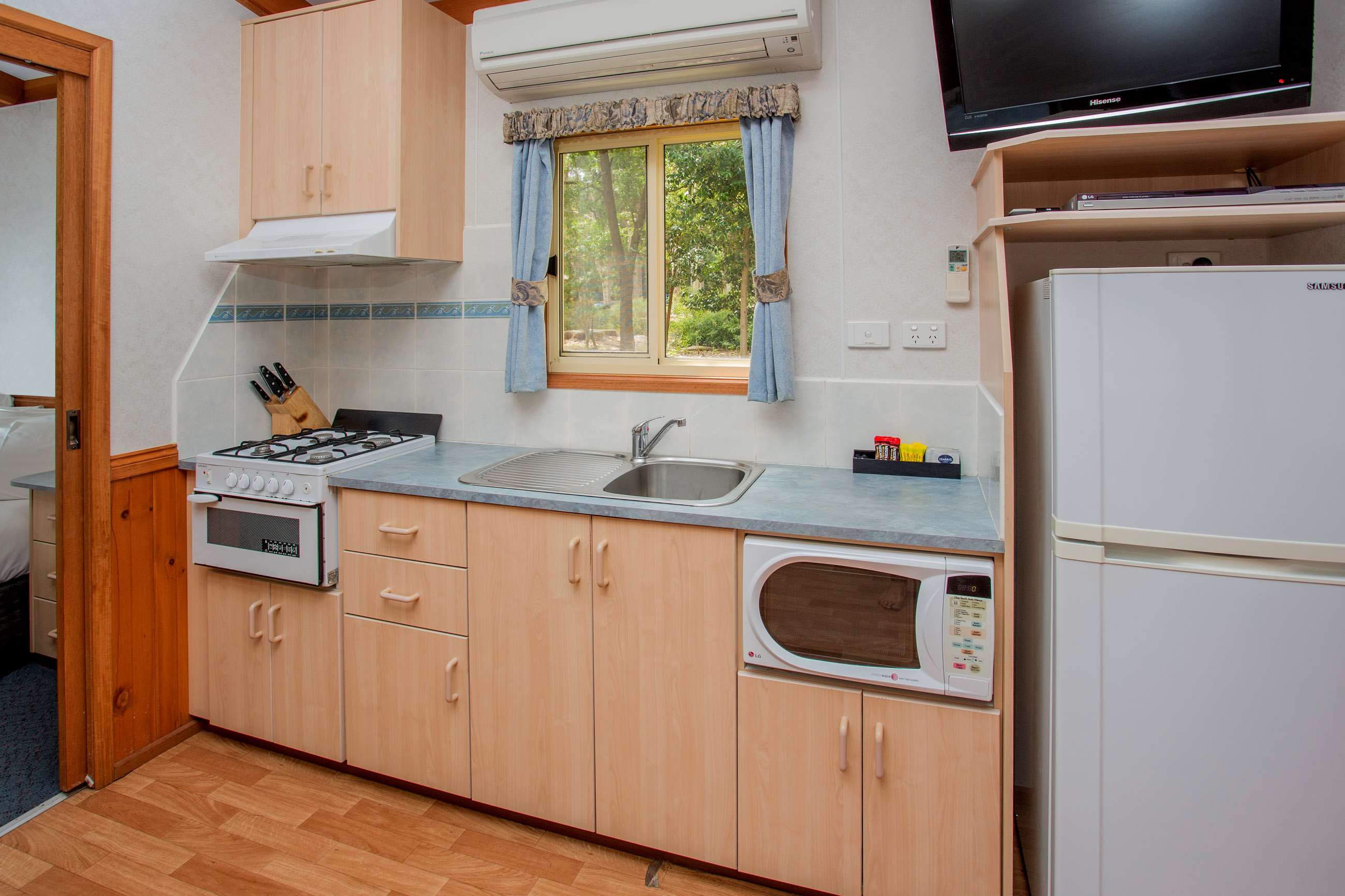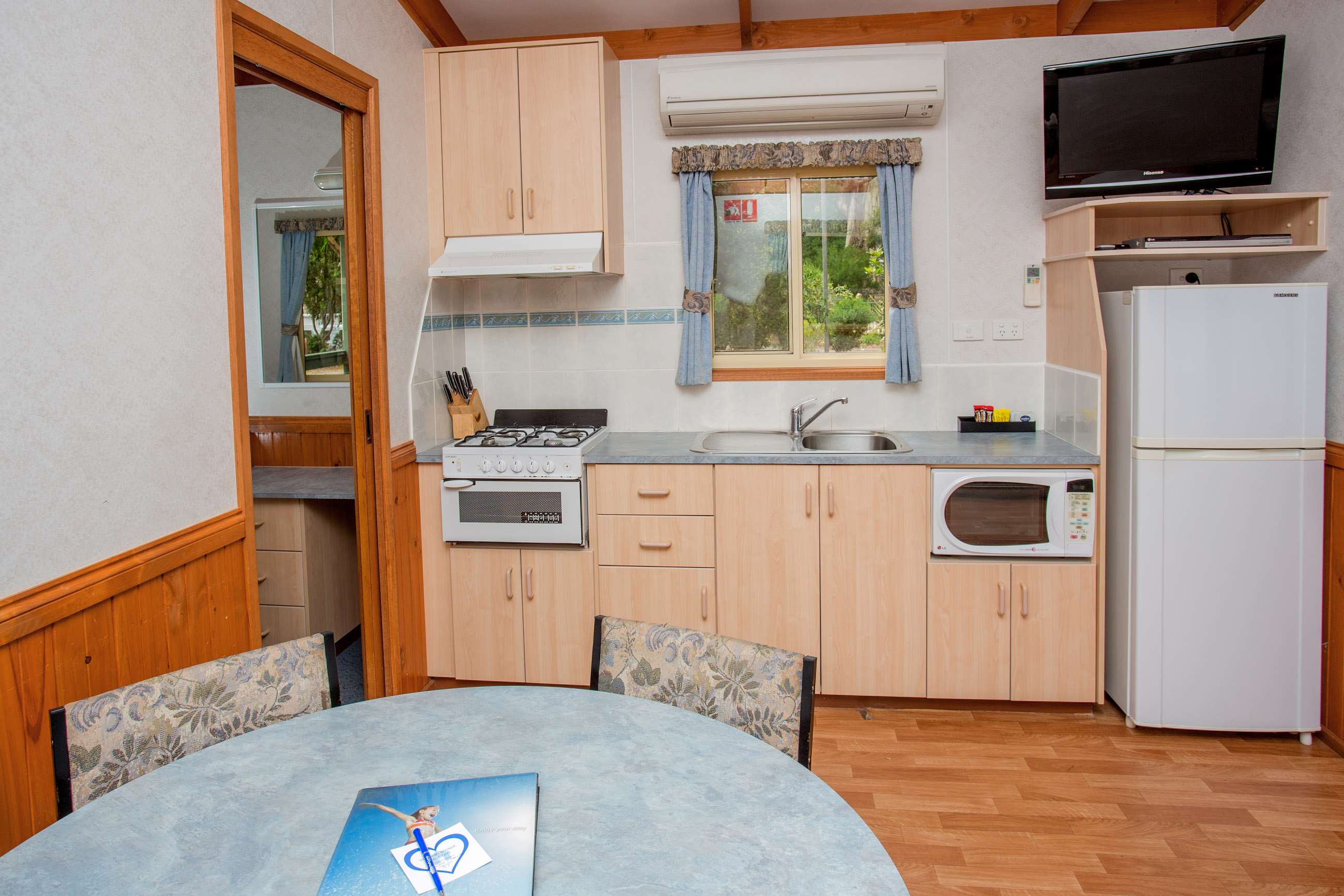 Standard Cabins are a great space to enjoy your holiday with the family. The functional space provides you with all your needs and sleeps 6 with a queen bed and bunks in an open concept cabin with kitchen, living and dining space and verandah.