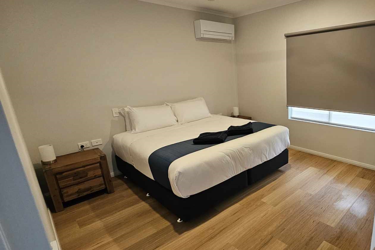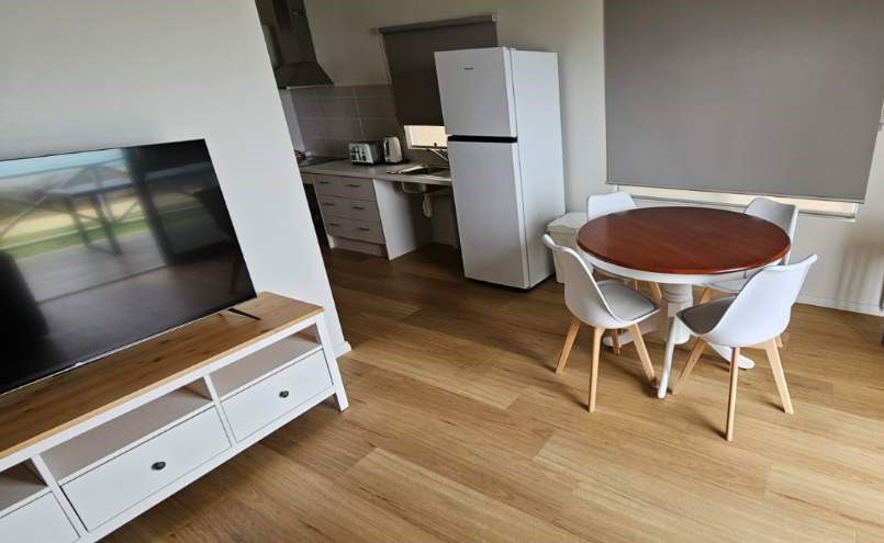 Entry to the Chalet is via a ramp making it easy access for mobility frames, wheelchairs and prams. Featuring an open plan living with Air-conditioning and dining area opening up to a private veranda with outdoor dining. King bed in bedroom 1 with Air-conditioning. King singles in bedroom 2.
