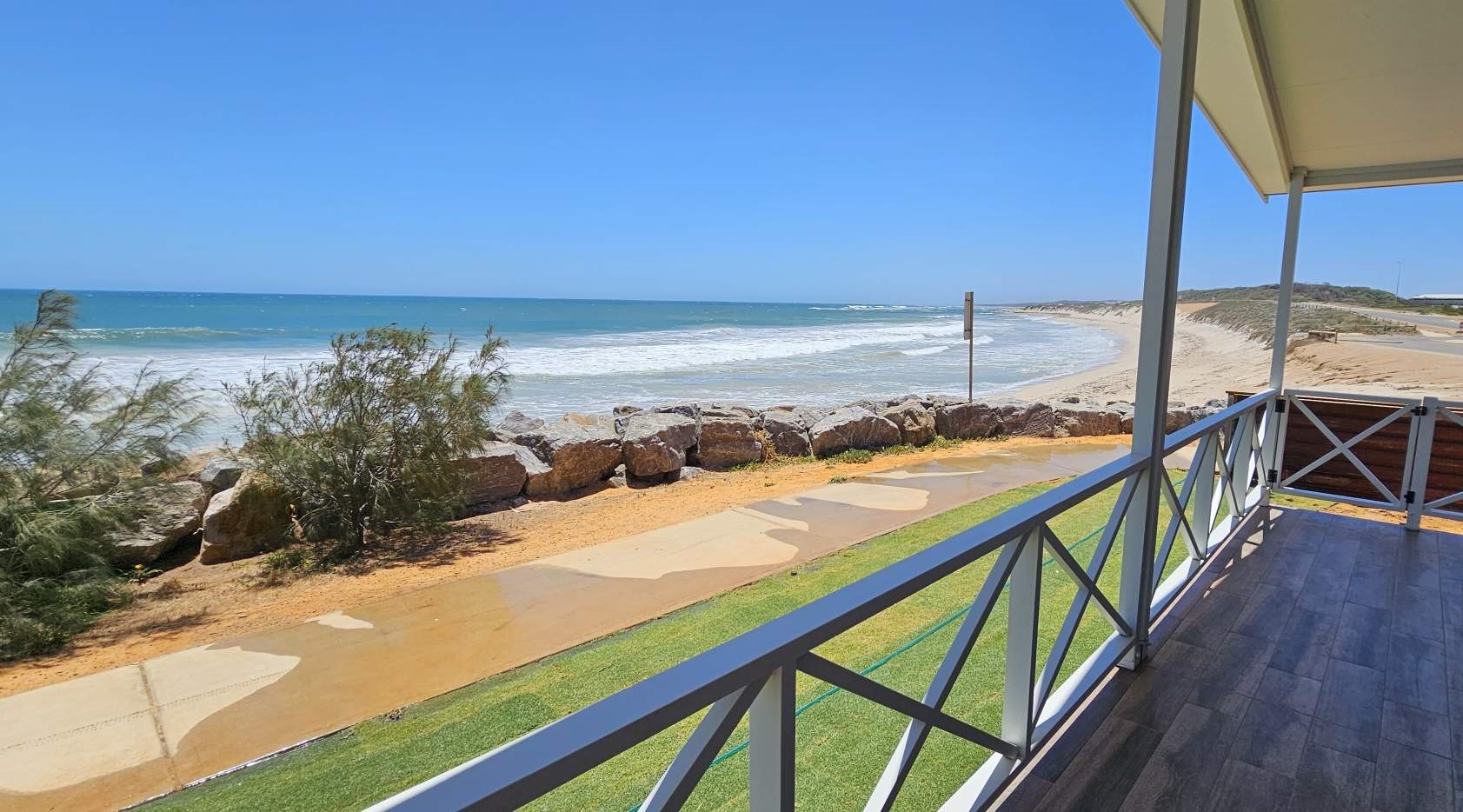 Absolute beach front fully self-contained three bedroom Superior Waterfront Chalet. Features a king size five star ensemble mattress in the main bedroom with ensuite and two king single beds in the second and third bedrooms. (By prior arrangement and a fee of $40.00 per bedroom – king beds can be separated into single beds or single beds can be joined into king size beds).