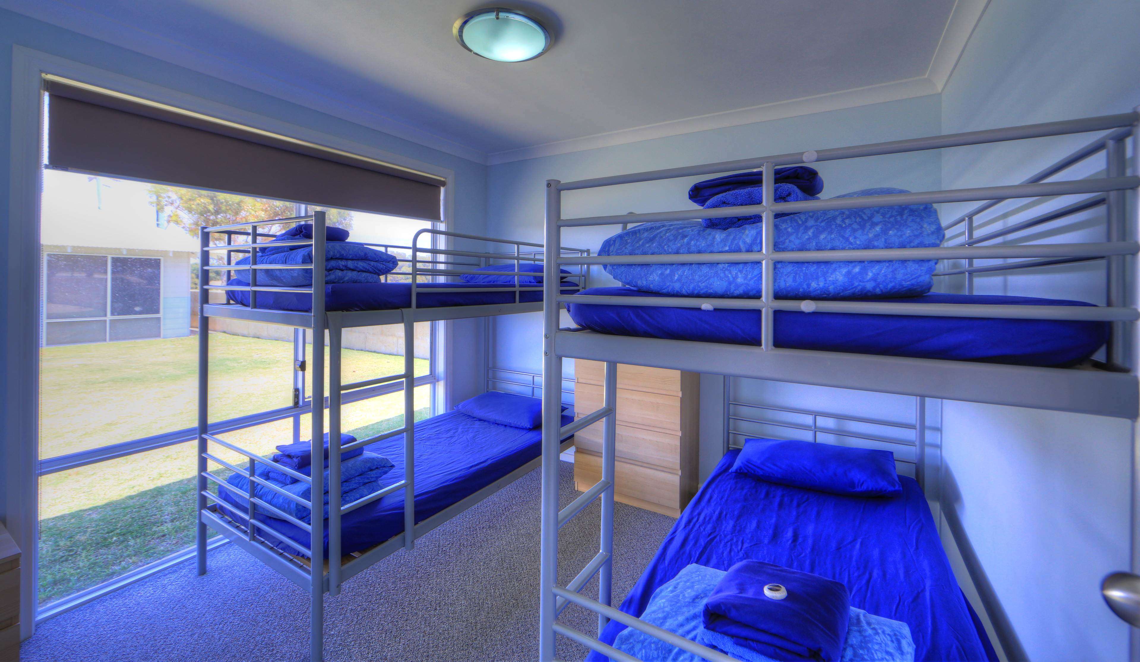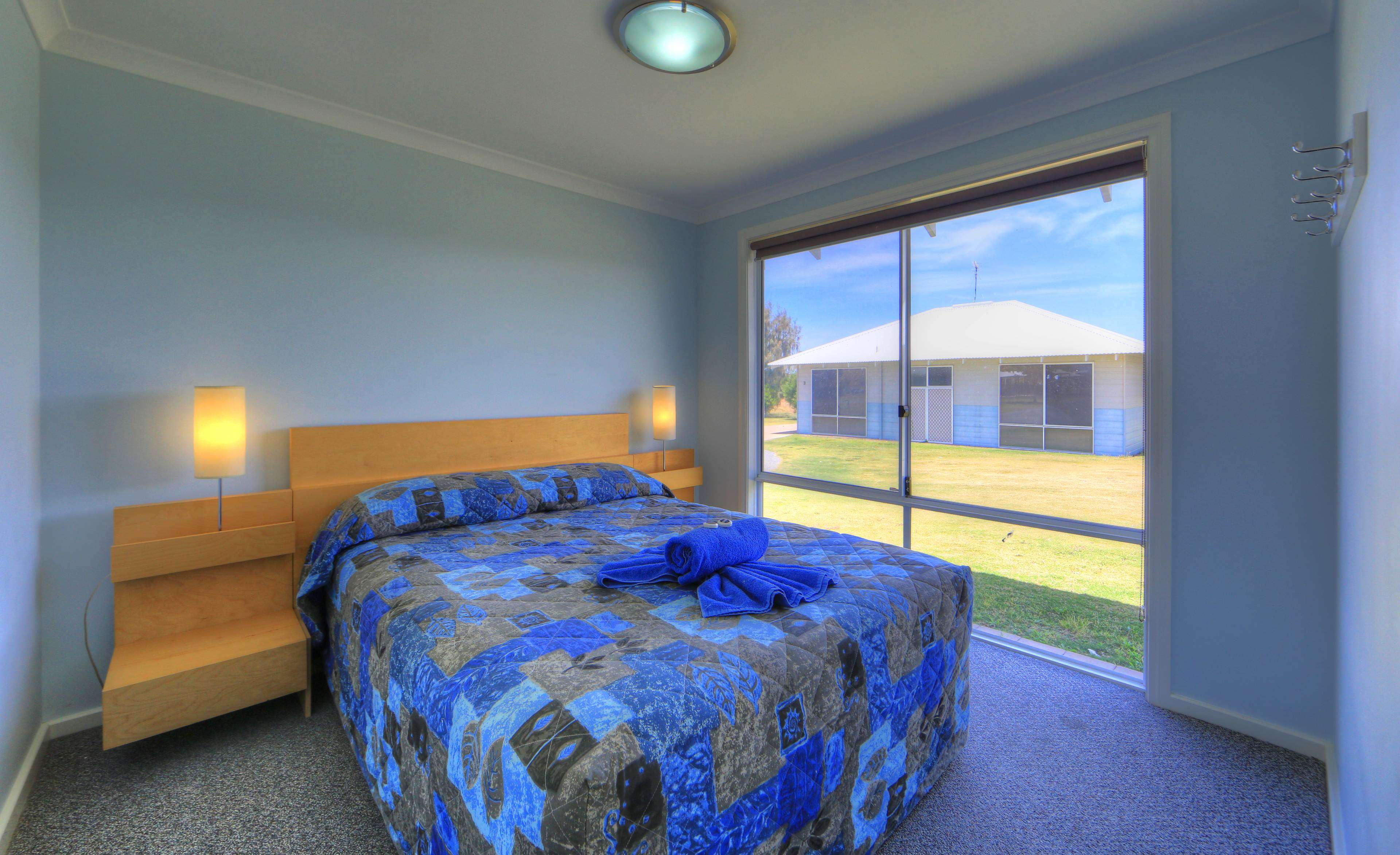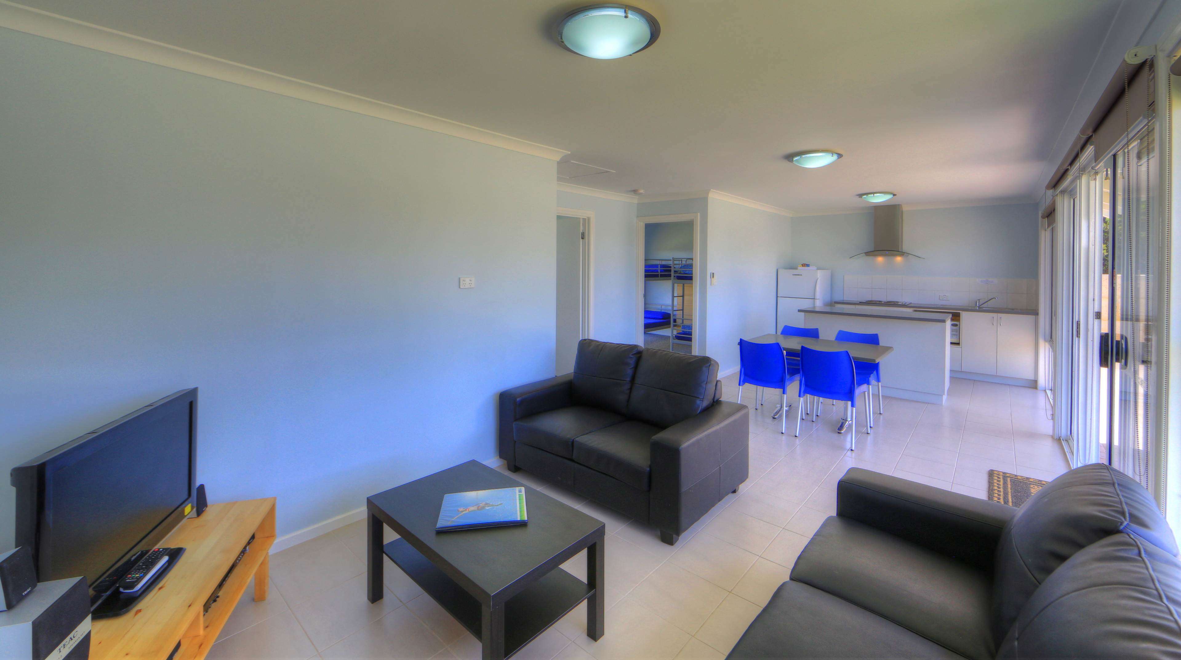 Modern cabin ideally located either near the children's playground and swimming pool, or in quieter location at the back of the park overlooking the park. It has two bedrooms that can sleep up to six guests with 3 different configurations suited mainly to families. There is a queen bed in the main bedroom, and either bunk beds or single beds and a double sofa bed in the second bedroom. The chalet has reverse cycle air-conditioning, a sofa, television, DVD player, fully equipped kitchen and dining area. Please advise your preferred location on booking.