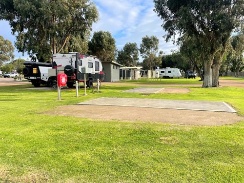 Campsite with power and water supplied, with the amenities block nearby.