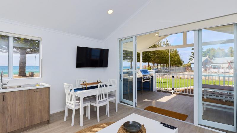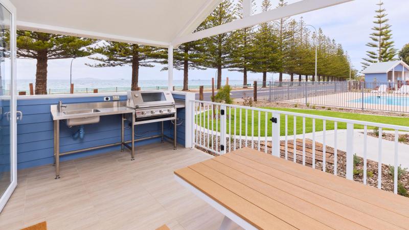 Offering views across to Esperance Bay, our Two Bedroom Bay Villa sleeps up to five people. One of our popular self-contained family villas, this premium option includes a queen bed, single bunk bed and a single bed. Accommodation facilities include free Wi-Fi, a full kitchen with fridge, oven, microwave and stovetop, a bathroom, open plan living and dining, a smart TV, plus a washing machine. You can also relax on the veranda, complete with BBQ facilities and an outdoor setting. Our bay view villa is air-conditioned and comes with a single car parking bay.
