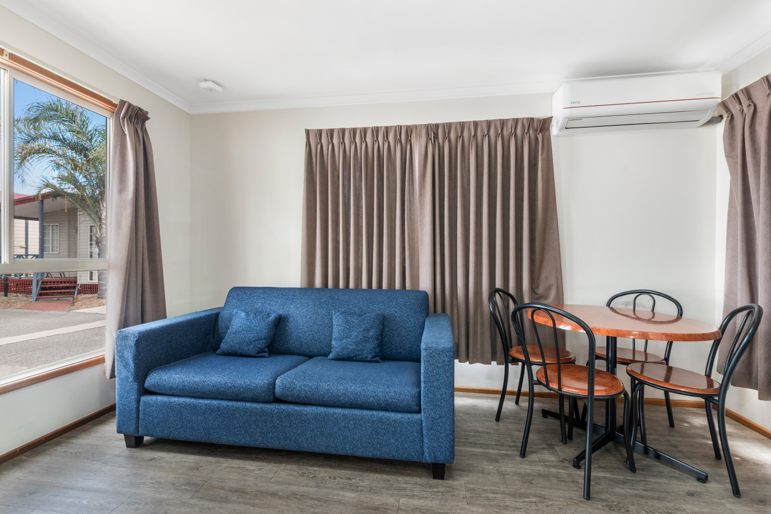 Our One Bedroom Cabins are self contained with 1 double bedroom and fold out sofa bed in lounge room, sleeps maximum of 4 people including children. Bathroom with shower, toilet and basin, full kitchen facilities with fridge, stove top, microwave, all cooking utensils etc, dining room, air conditioning, heating, lounge room with TV and DVD, all linen provided for 2 people.