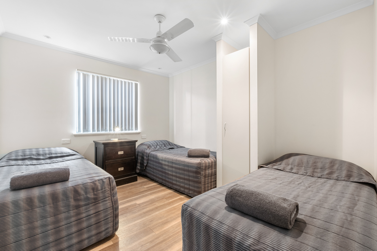 Our 2 bedroom Deluxe Cabins are self contained with 1 king bedroom and 3 king singles in second bedroom. Sleeps maximum of 5 people including children. Bathroom with bath/shower, basin and toilet, full kitchen facilities with fridge, microwave, stove with oven, dishwasher, all cooking utensils etc, lounge room with LCD TV and DVD, CD player, spacious dining room, air conditioning and heating. All linen is provided.