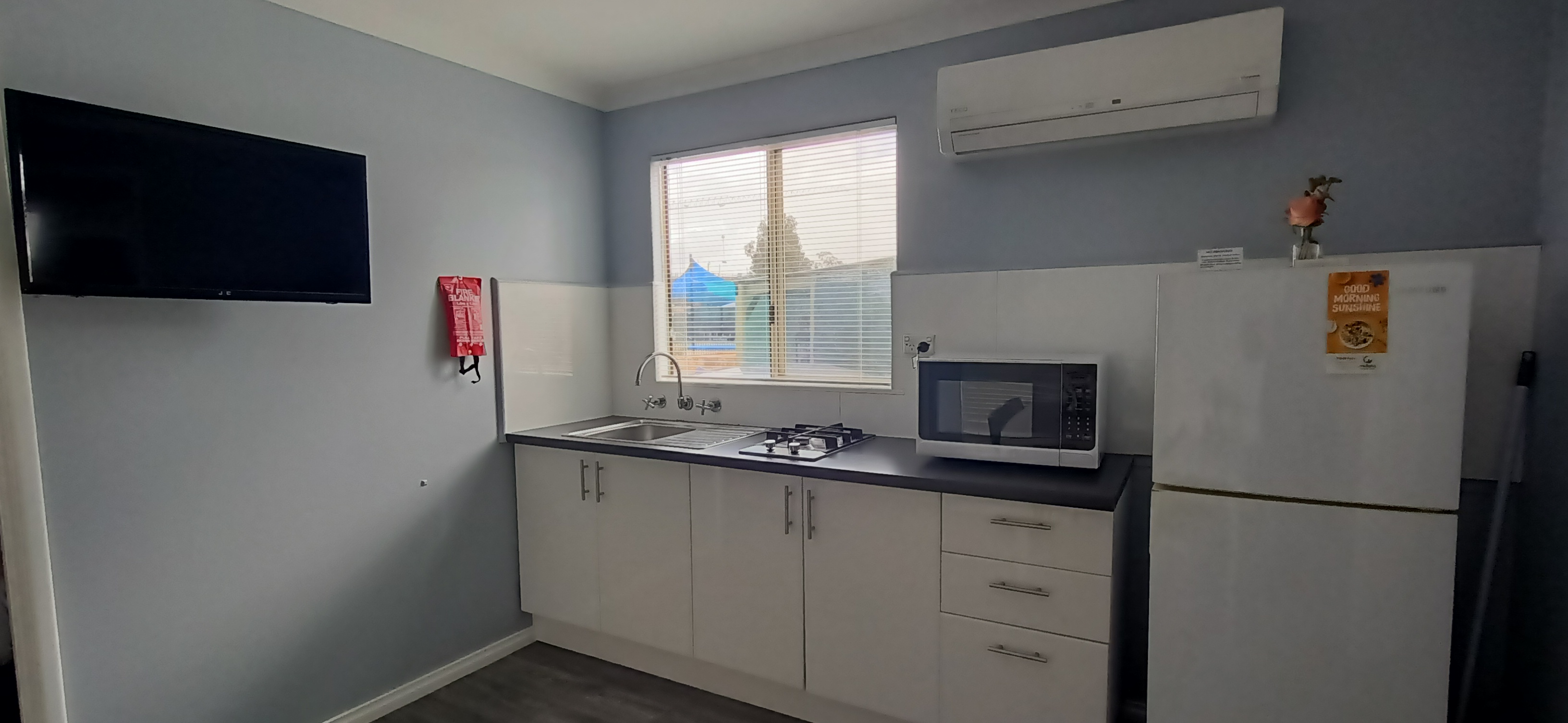 It includes a private bathroom, air conditioning, and a TV for added convenience. A kitchenette equipped with a microwave, toaster, kettle, and fridge provides all the essentials for a cosy stay.