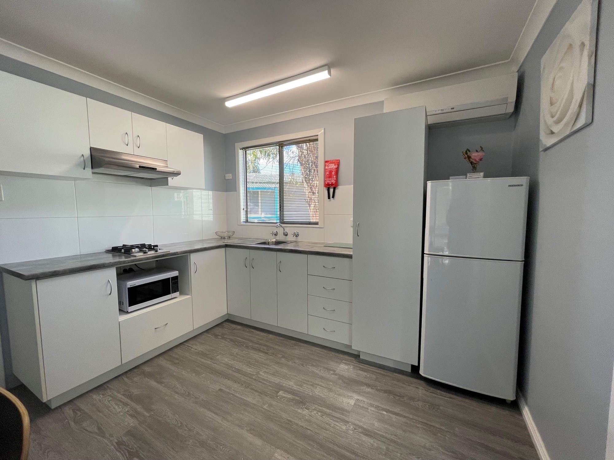 Enjoy a fully equipped kitchen with microwave, fridge, toaster, and stovetop, along with air conditioning and a TV for a cosy night in. The private bathroom and outdoor deck with seating make it a practical choice for couples or small families.