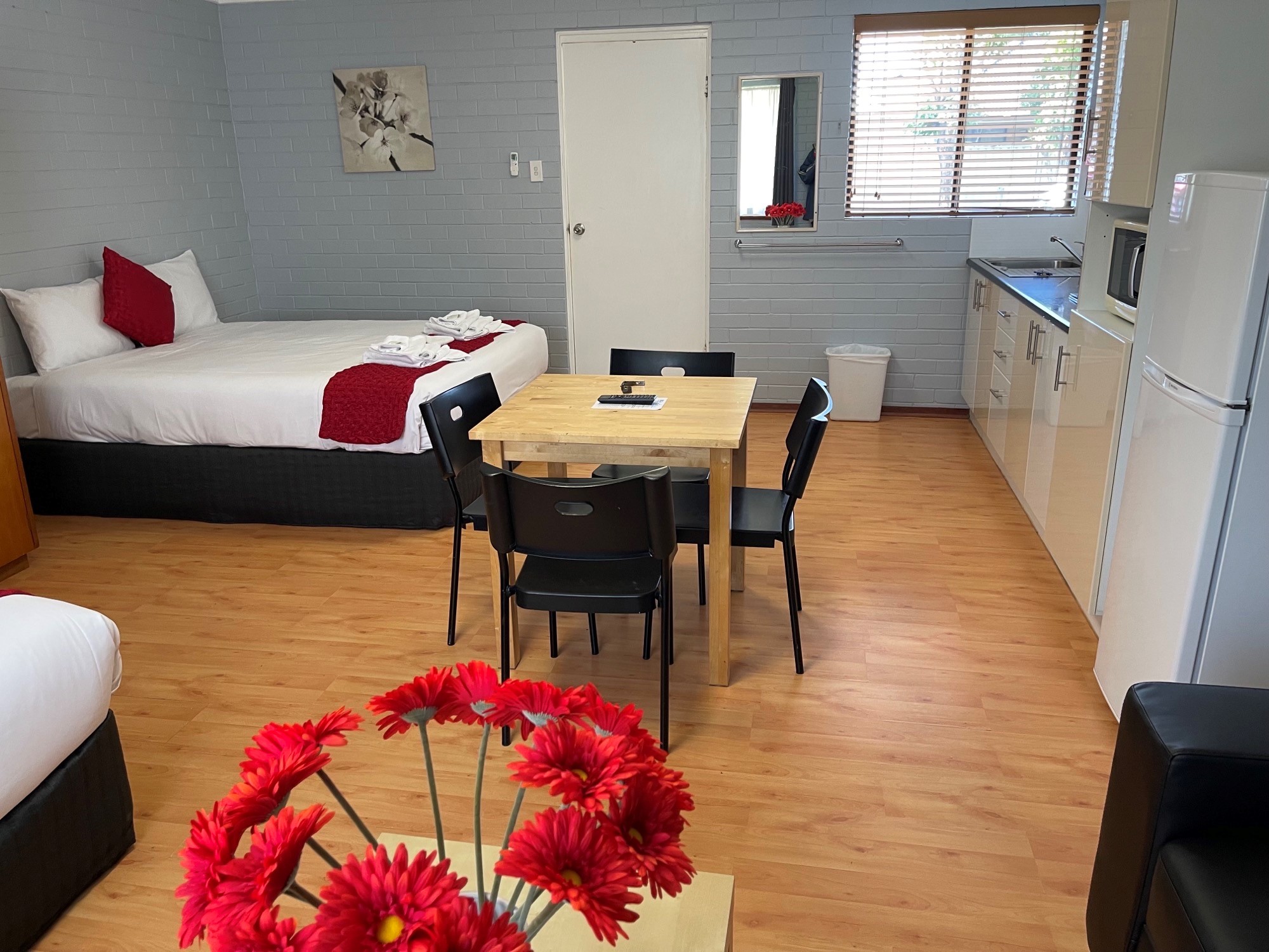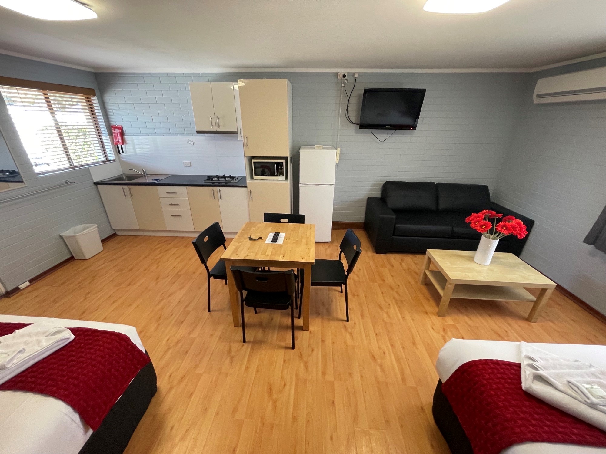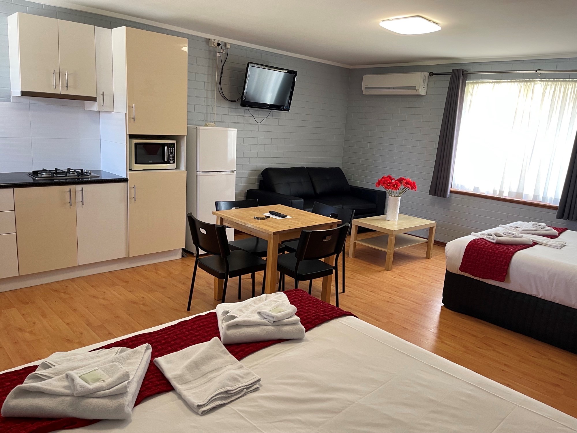 Designed for budget-conscious travellers, it includes air conditioning, a TV, and a fully equipped kitchen with a stovetop, microwave, and fridge. Guests have access to nearby shared bathroom facilities, making it a practical choice for group stays. Please note: Two of these studio types can accommodate up to five guests, offering additional flexibility for larger groups.