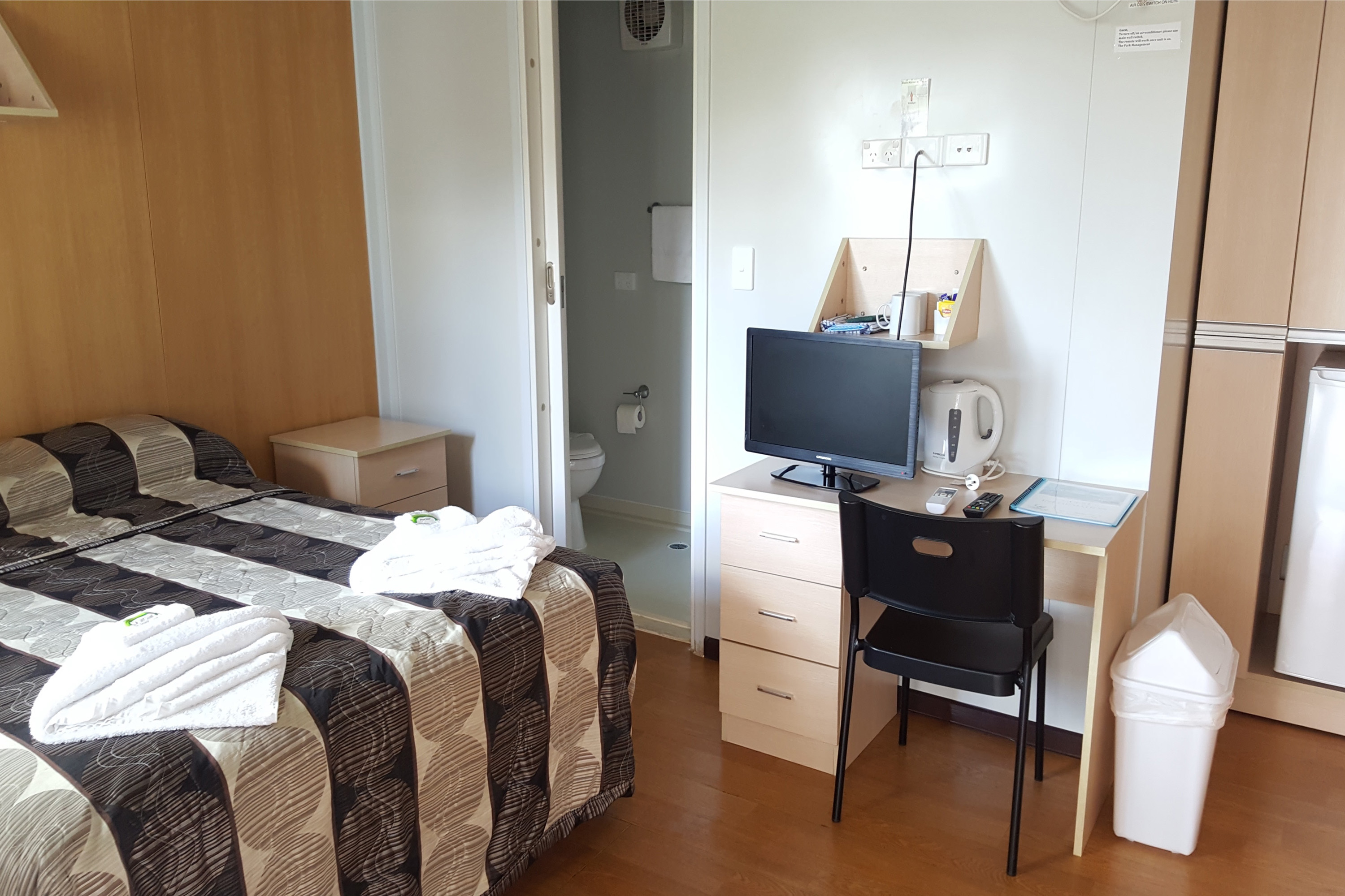 While in-room amenities include air conditioning, a TV, and a bar fridge, guests can also enjoy the convenience of a shared kitchen located nearby. A small outdoor patio offers a relaxing spot to unwind after a day out.