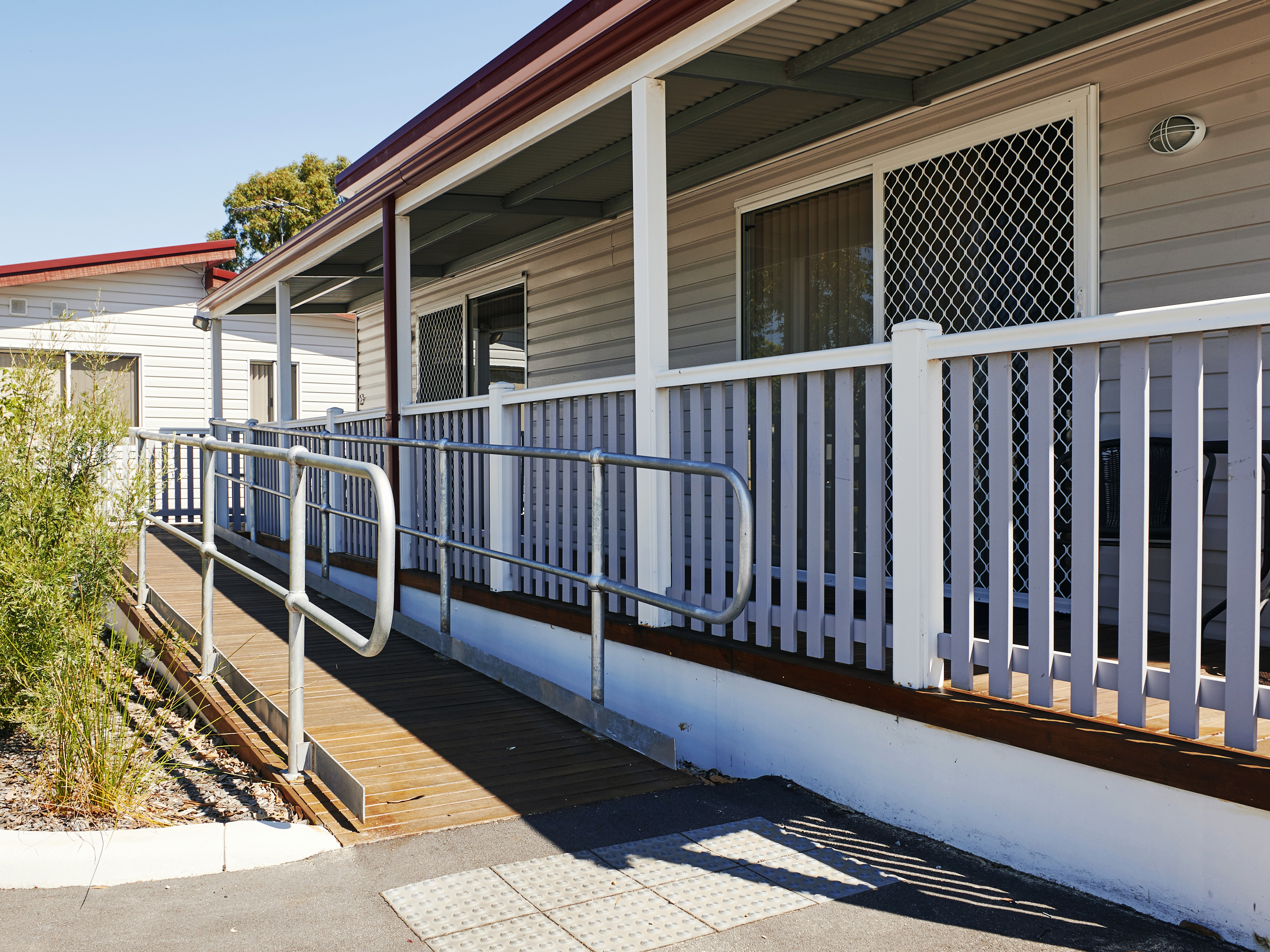 Please note: Two of these studios are designed for wheelchair accessibility. They include a roll-in shower, grab bars beside the toilet, and a ramp leading up to the cabin for easy access.