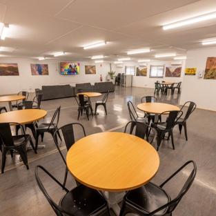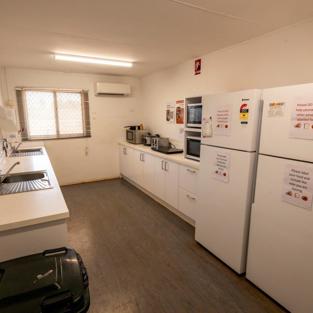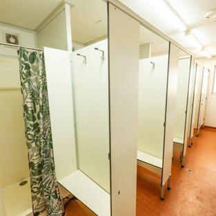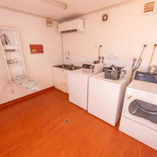 There is a laundry room with coin-operated washers, dryers, and an ironing station. The well-stocked camp kitchen features a fridge, sinks, microwaves, hot water boiler, kettle, toaster, and an induction hotplate.