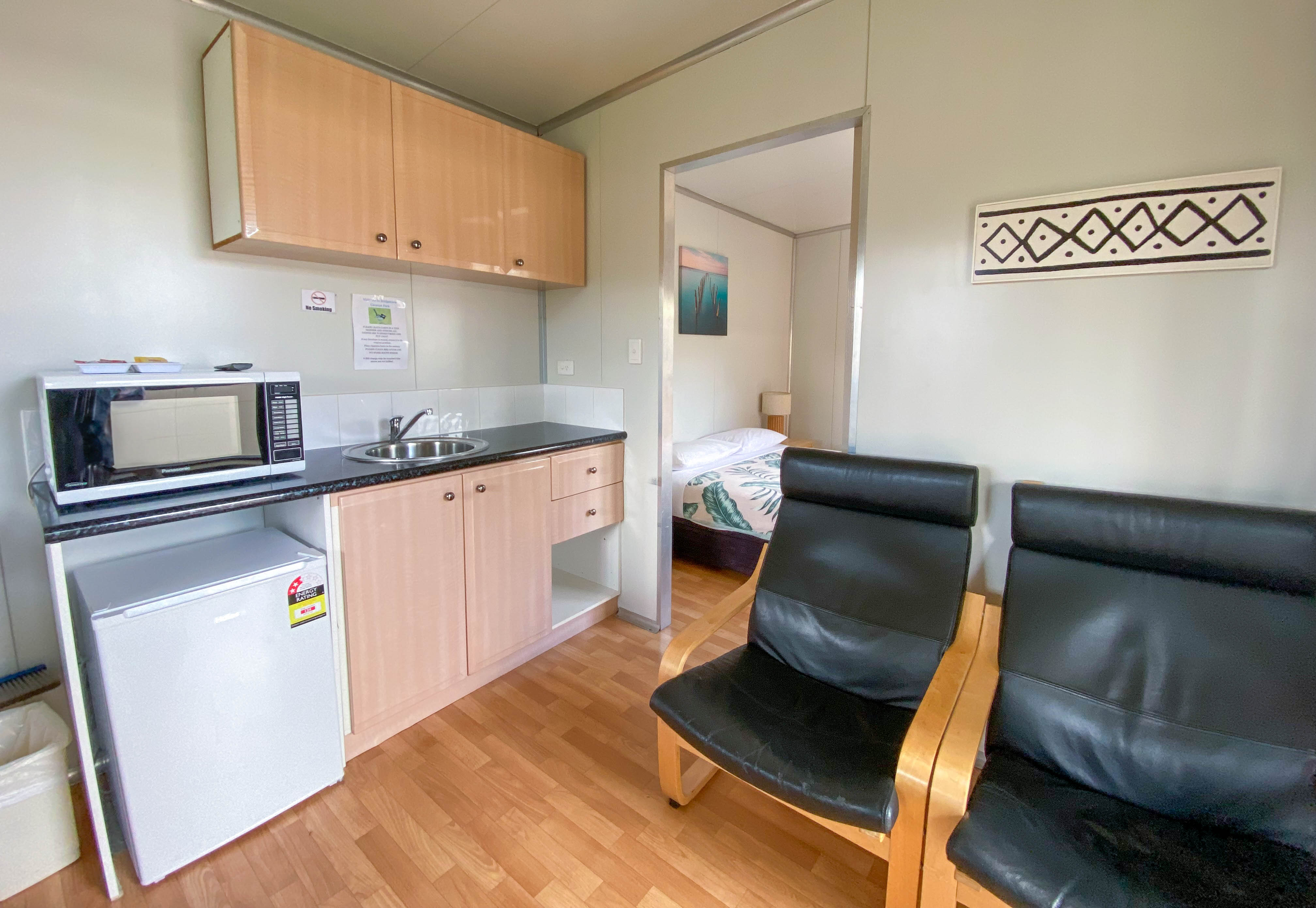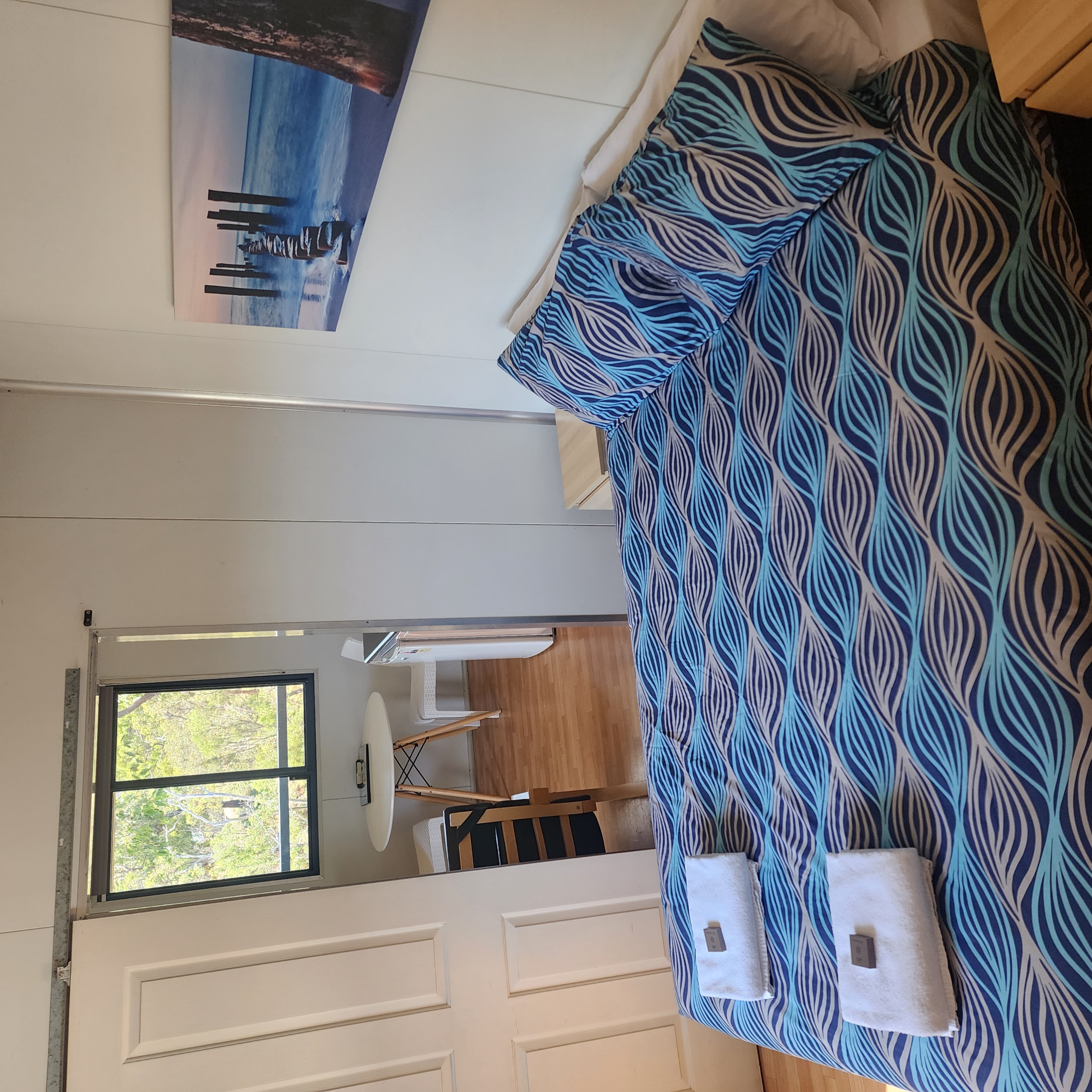 A fully self-contained unit featuring a double bed, a cosy couch, an ensuite and a fully equipped kitchen.