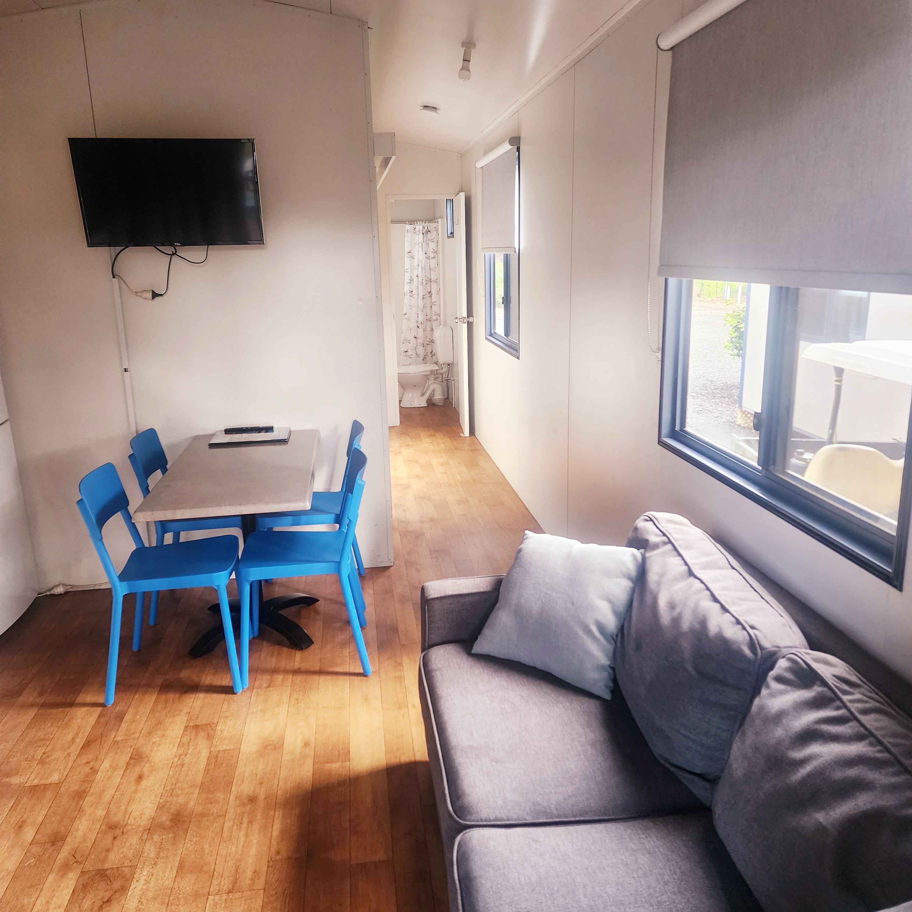 These fully self-contained cabins include a separate bathroom, a TV, and all linens and towels for your convenience.