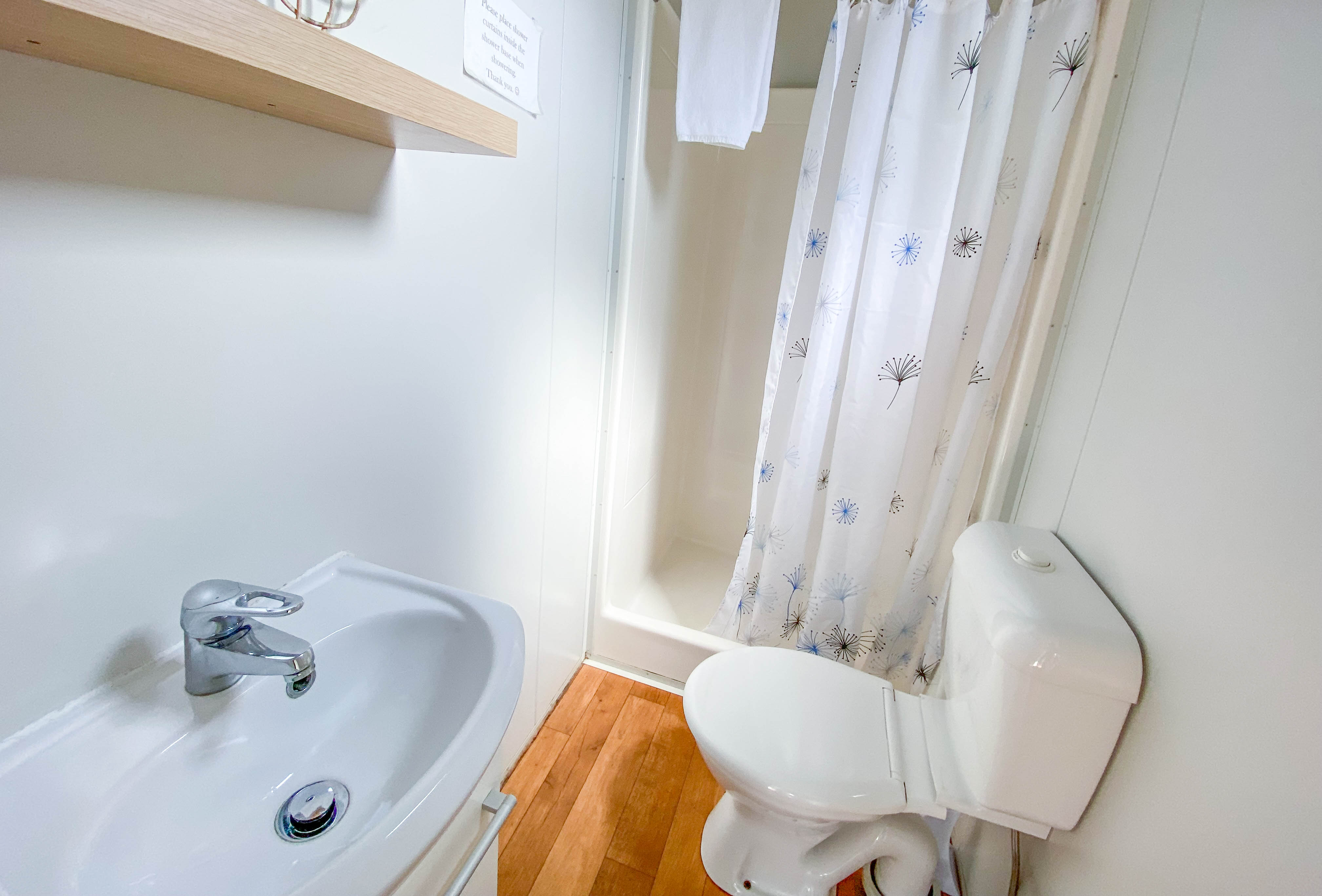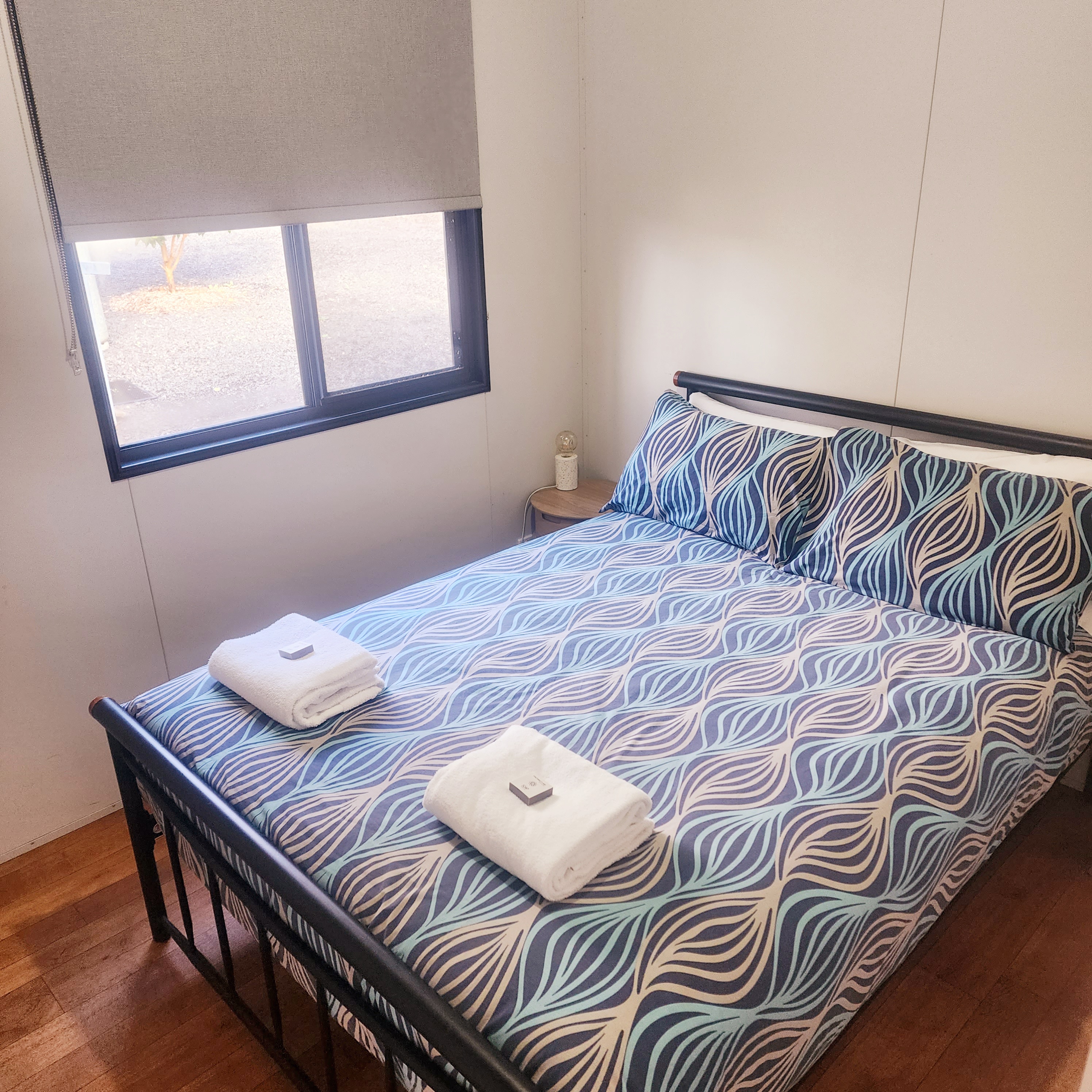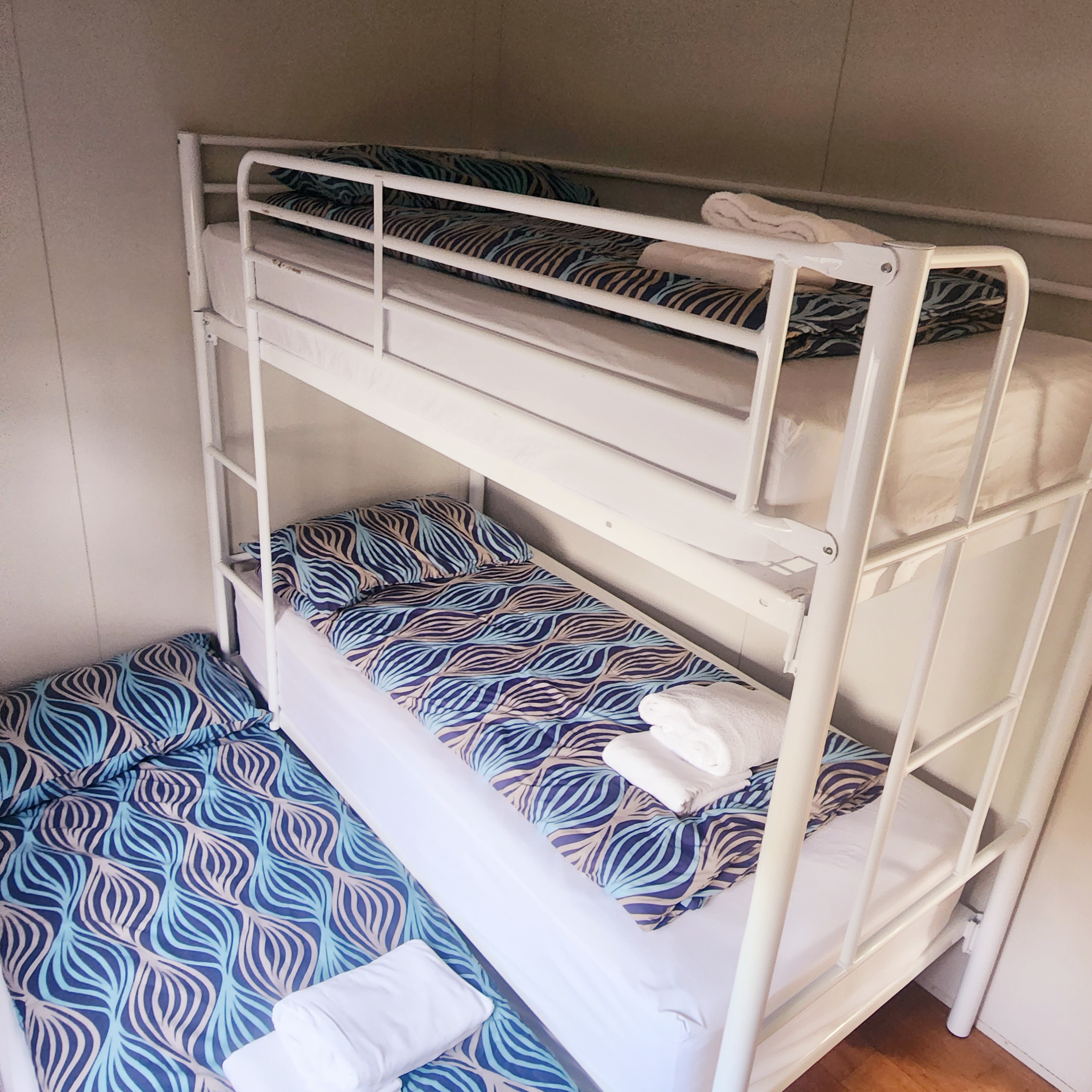 Our family cabins feature two bedrooms - one with a double bed and the other equipped with a bunk and single bed.