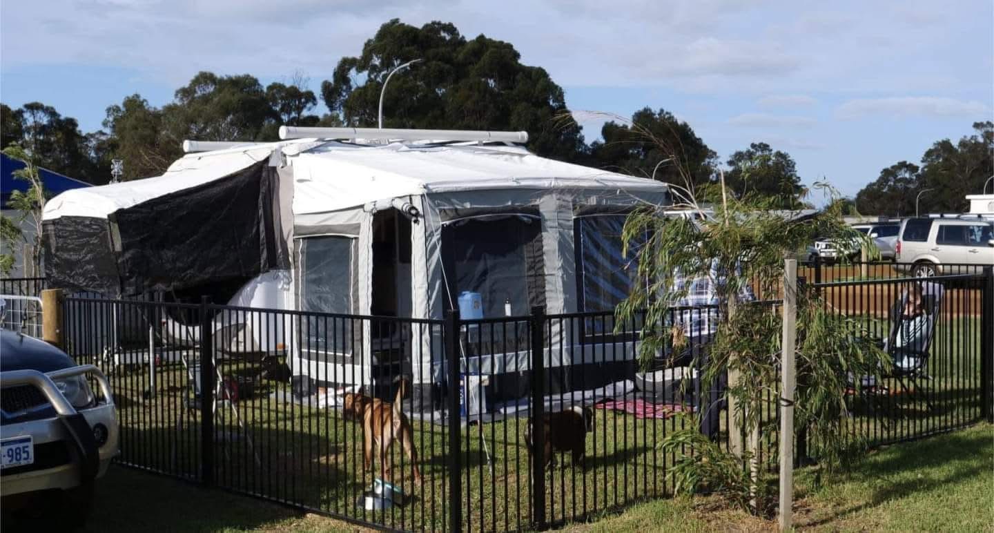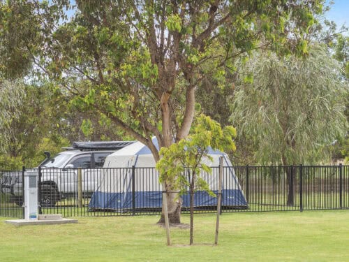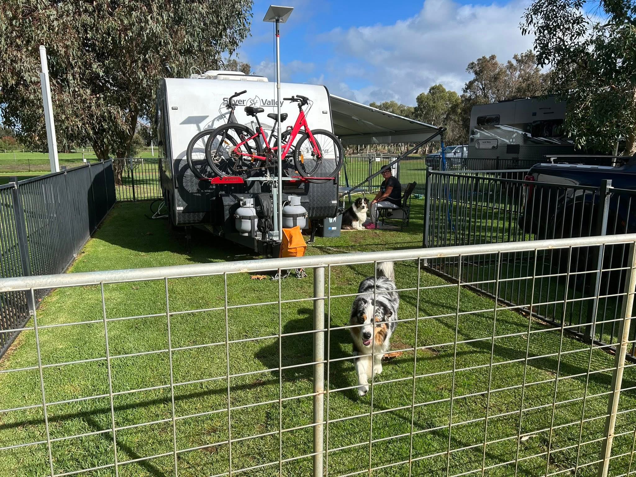 We currently offer 8 powered sites that are fully fenced for your pet to enjoy some time off their leash. These sites are fenced with 1200mm high aluminum pool fencing with a latched gate on the front. Once you are in your enclosure and your gate is secure, your pet is able to wander free around your site. Three of these sites are for caravans only (no swags, tents, camper trailers or any soft flooring etc) and fit caravans up to a length of 10m. The remaining four fenced sites have a synthetic grass surface to accommodate tents, swags, camper trailers or any caravan up to a length of 7.5m. These sites all have power and water on site.