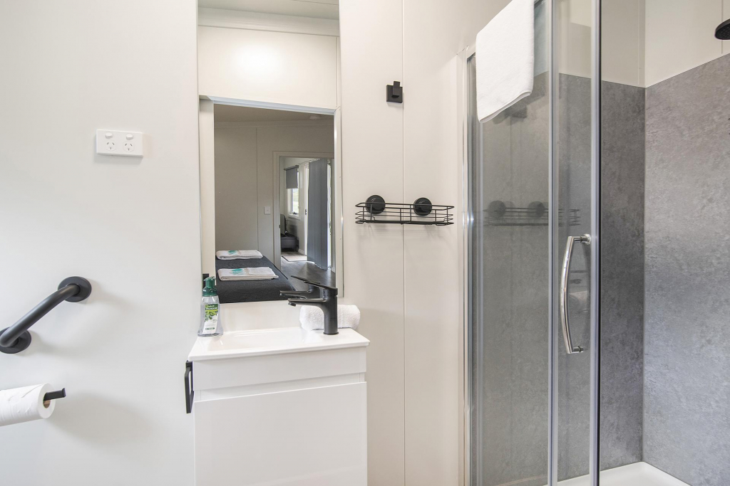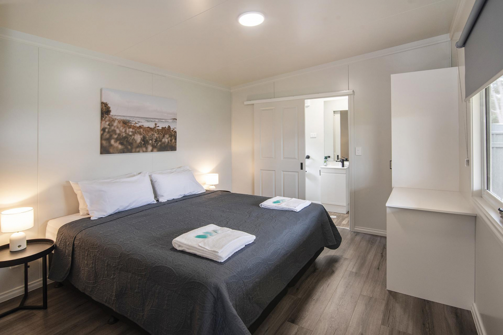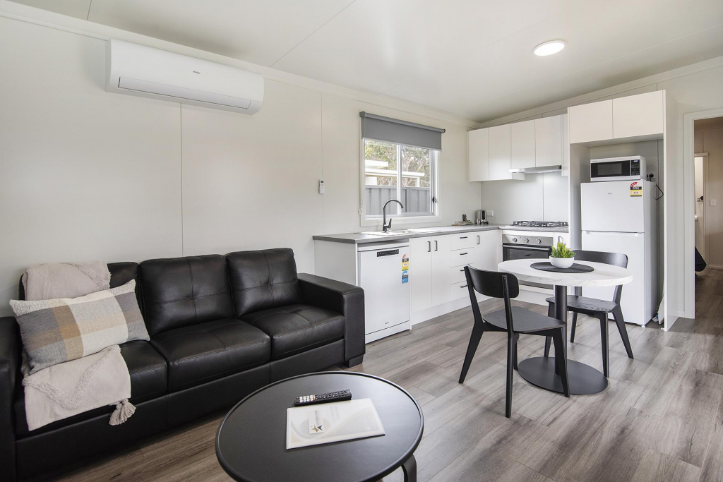 Our One Bedroom Cabins accommodate two people. They offer a deluxe king size bed, a self contained bathroom, along with a spacious living and kitchen area. The kitchen has a fridge, dishwasher, full sized oven, stovetop, microwave and all the kitchen essentials. Linen, pillows and towels are supplied. Complimentary tea, coffee, sugar, milk is provided. The kitchen/living area has air conditioning/heating.