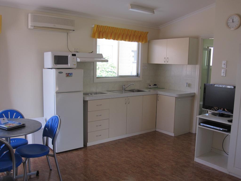 The chalet has a self-contained kitchen including a fridge, microwave, stovetop, and plenty of crockery and cutlery with a dining table, lounge, and a TV in the living area. The bathroom in the chalet includes a shower, toilet, and vanity. The chalet is air-conditioned for your comfort.