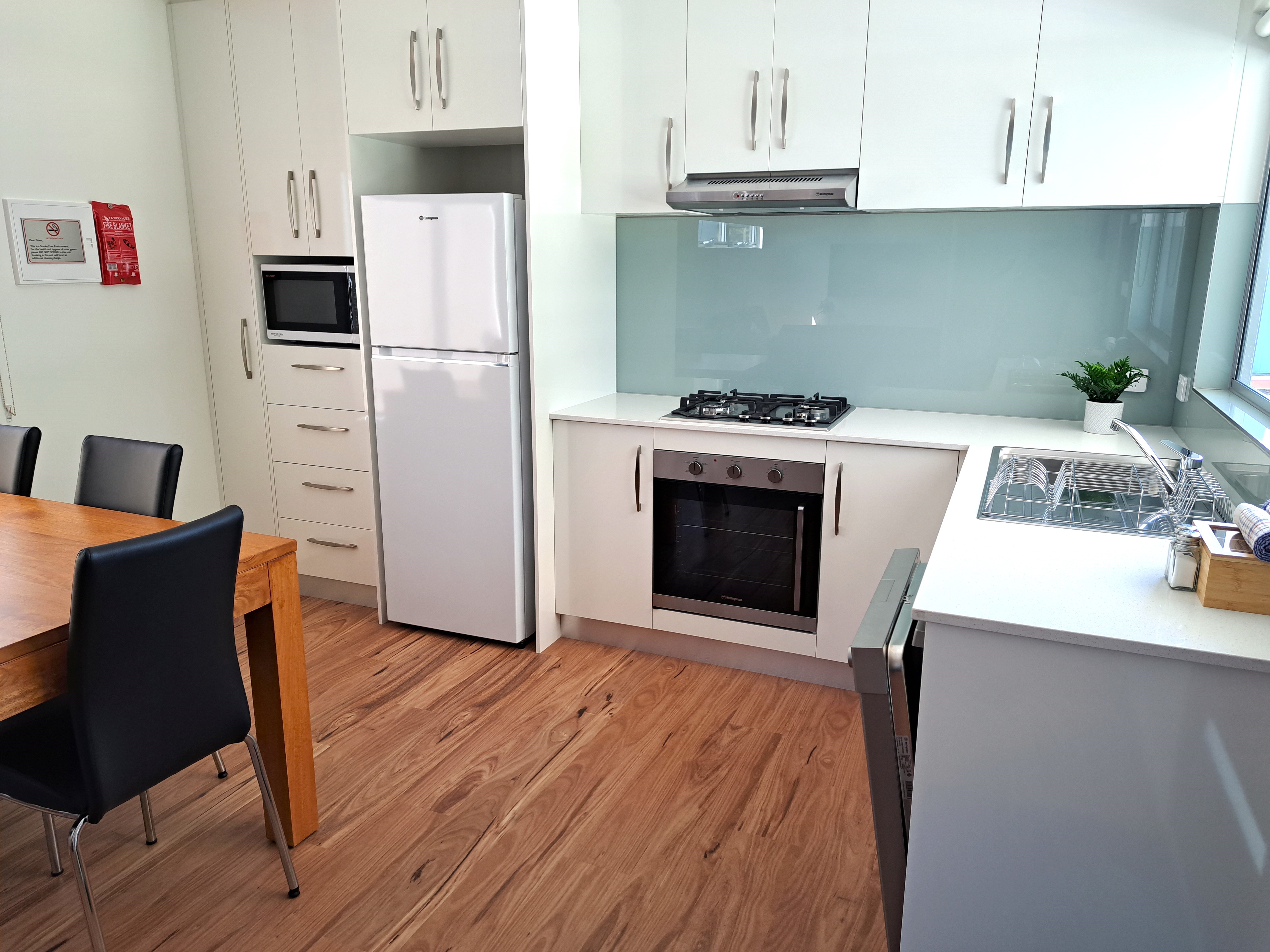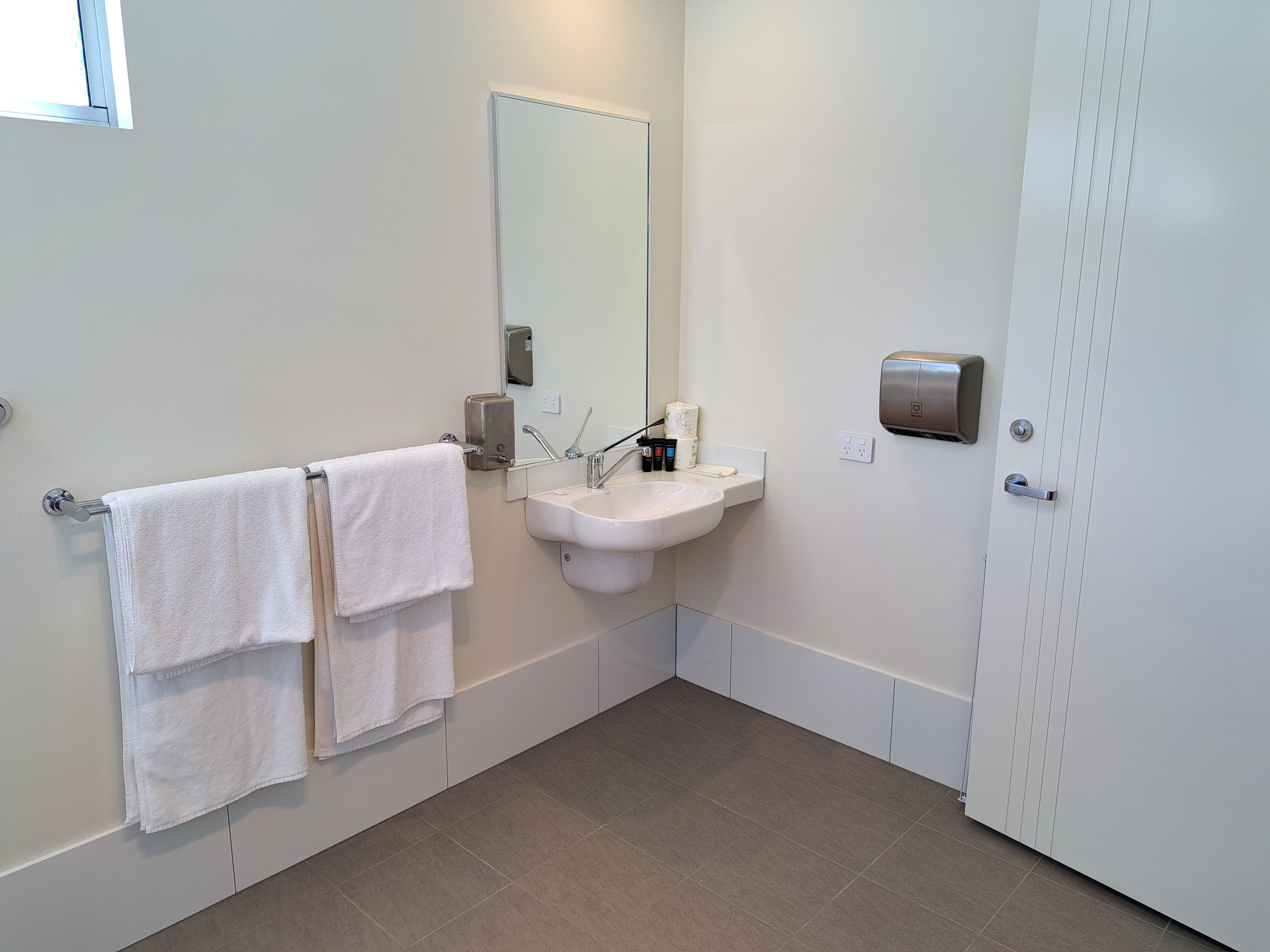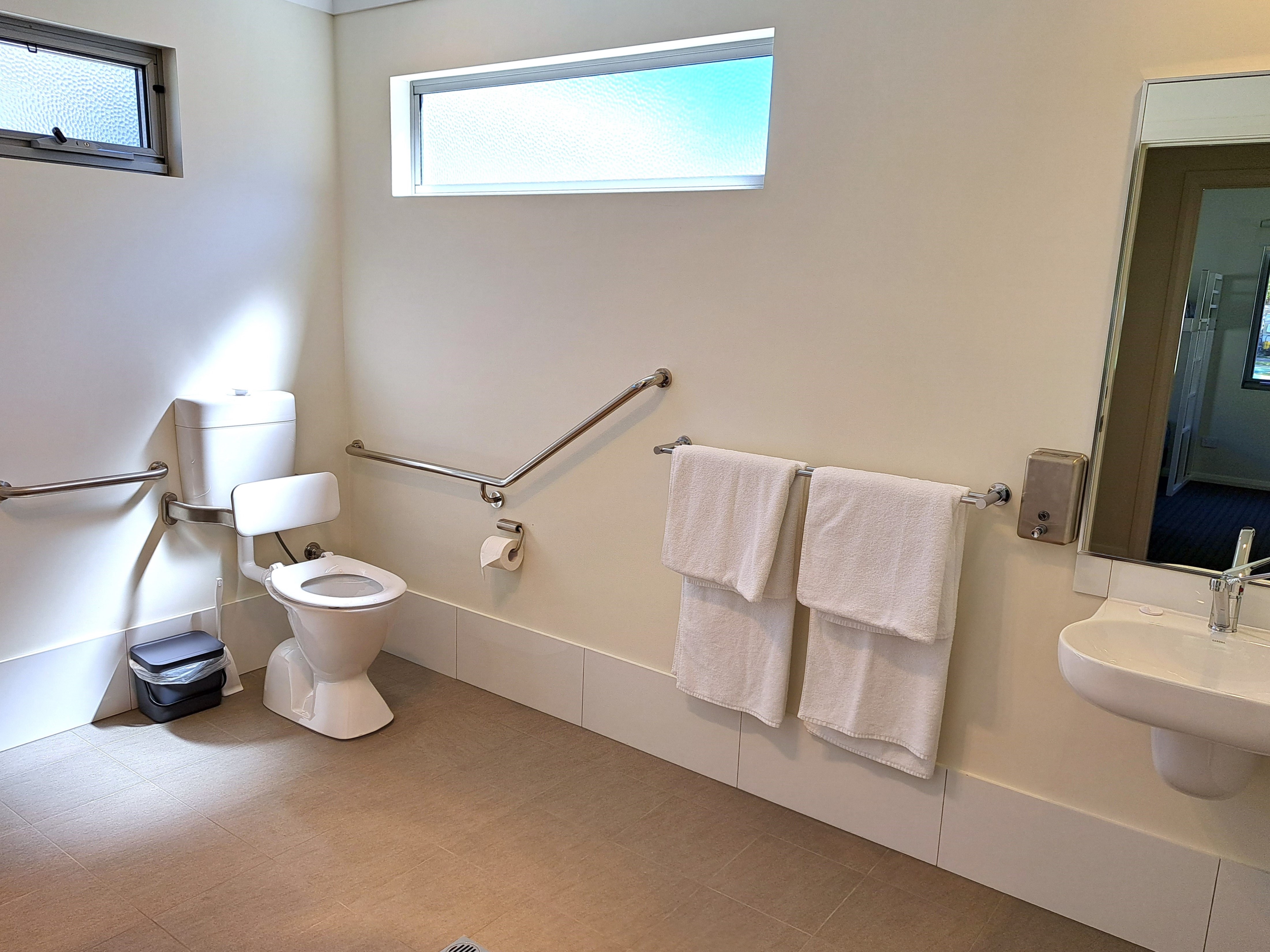 Our 2 Bedroom Deluxe Villa (Wheelchair Access) includes wider doorways, a ramp to the deck, and a fully accessible bathroom. The kitchen features a side-opening oven. The accessible bathroom has a wheel-in shower with grab rails, a shower seat, a toilet with grab rails, and a wheel-under basin.
