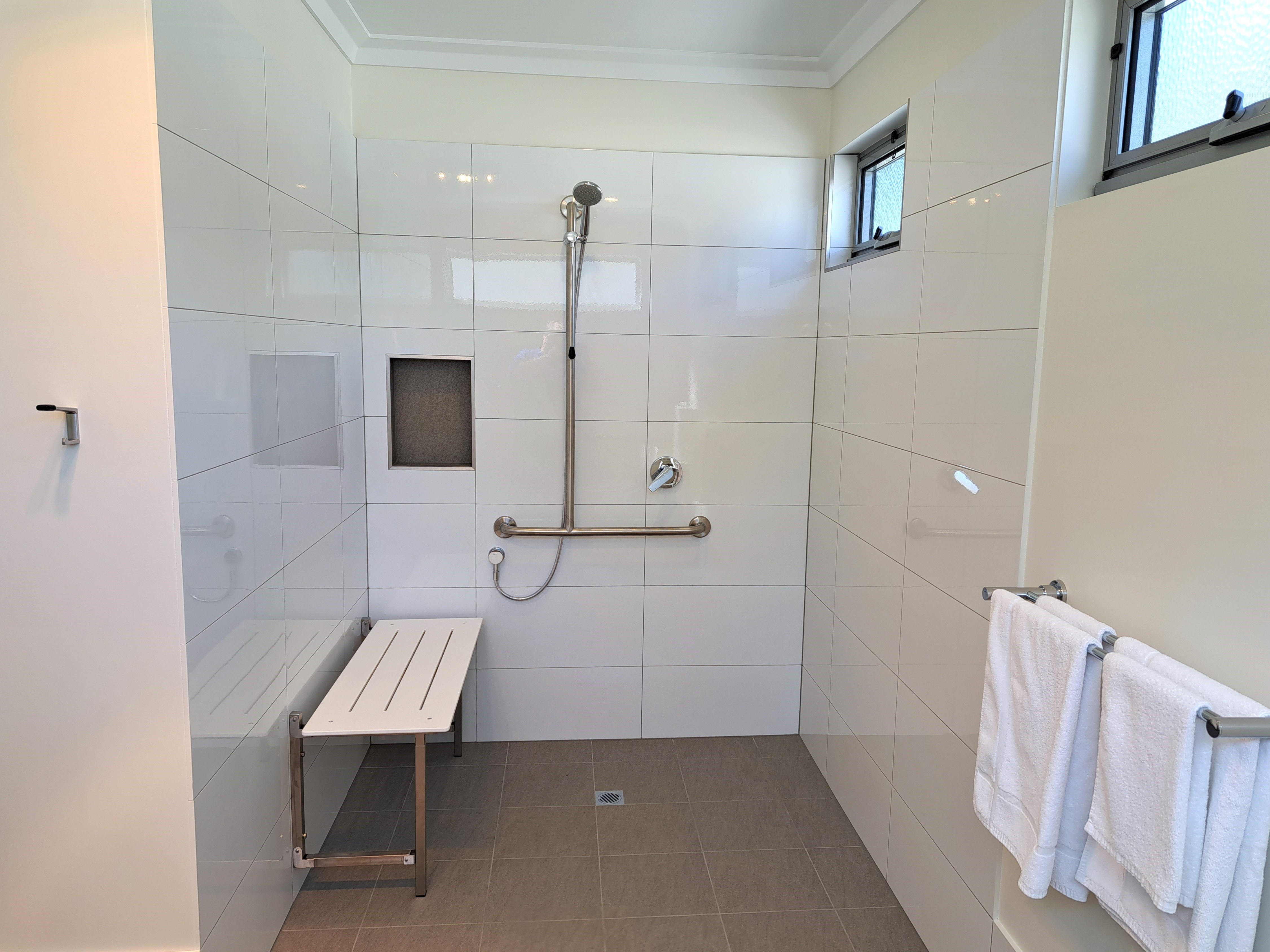 The accessible bathroom features a large wheel-in shower with grab rails and a shower seat, a toilet with grab rails, and a wheel-under basin.