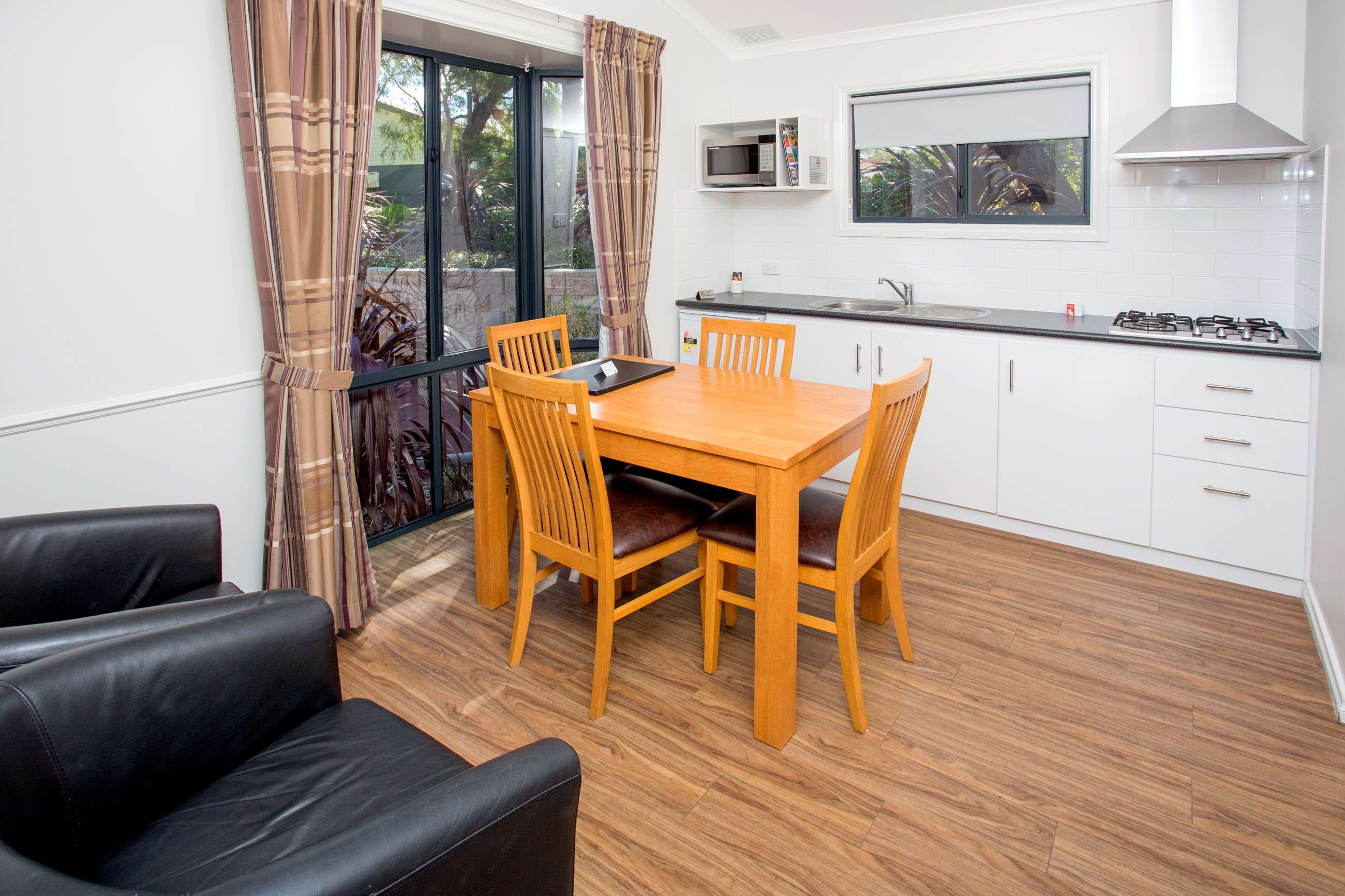 Nestled in stunning natural gardens, these chalets suit couples or small families. Inside, you'll find a main living area with a wall-mounted TV/DVD, two leather armchairs, a four-seat dining table, and a kitchen equipped with a bar fridge, microwave, and two-burner induction cooktop.