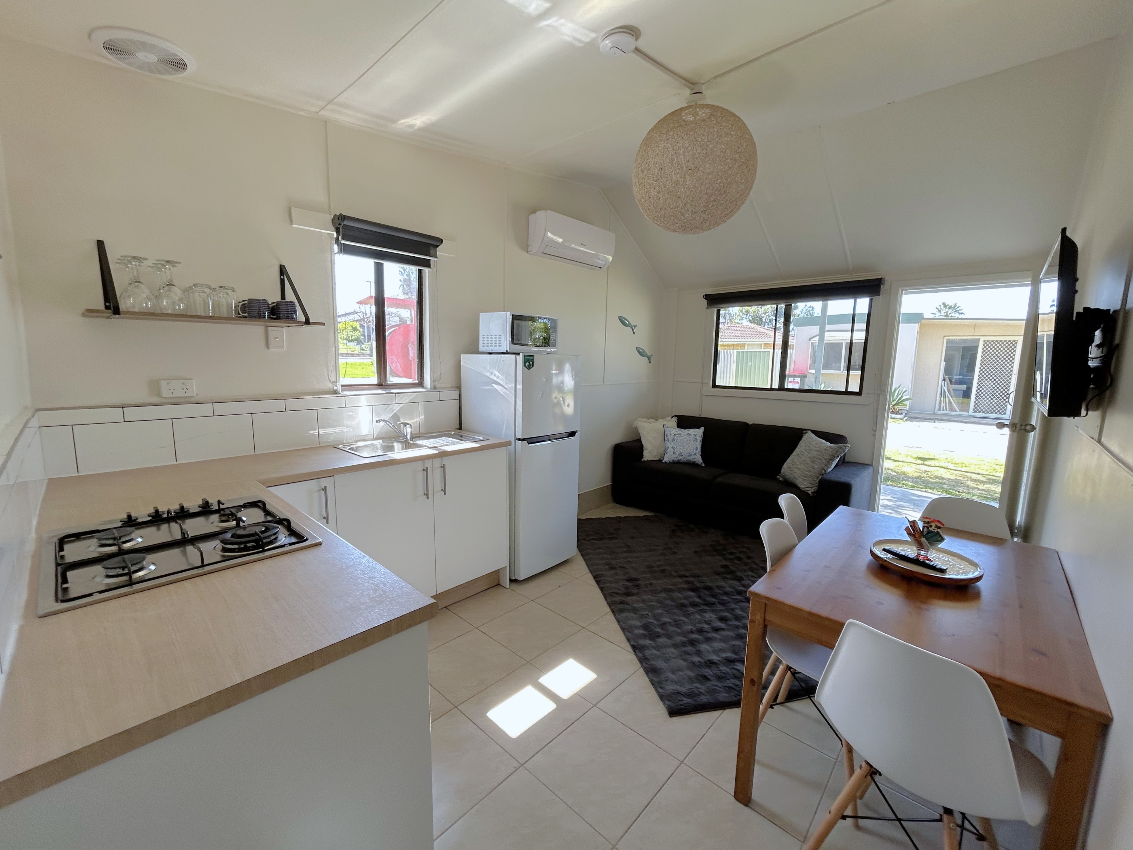 Our Kingfisher Beach Shack has a kitchen equipped with stove top and oven, convection microwave, full size fridge, toaster, cookware, utensils, cutlery and dining table.