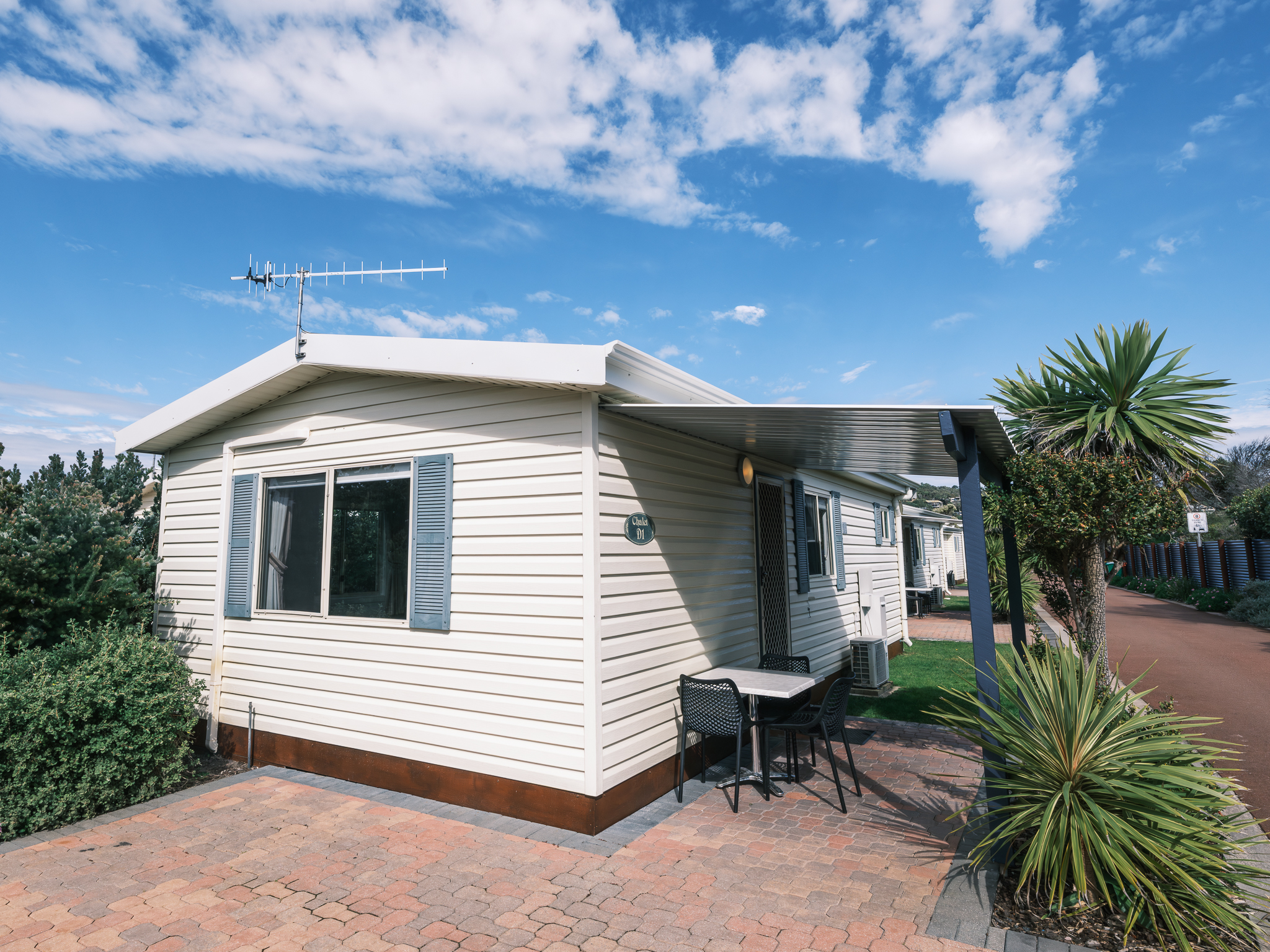 The lovely two-bedroom Chalet sleeps up to four or five guests with an outdoor patio area and outdoor setting for relaxing and passing the day away.