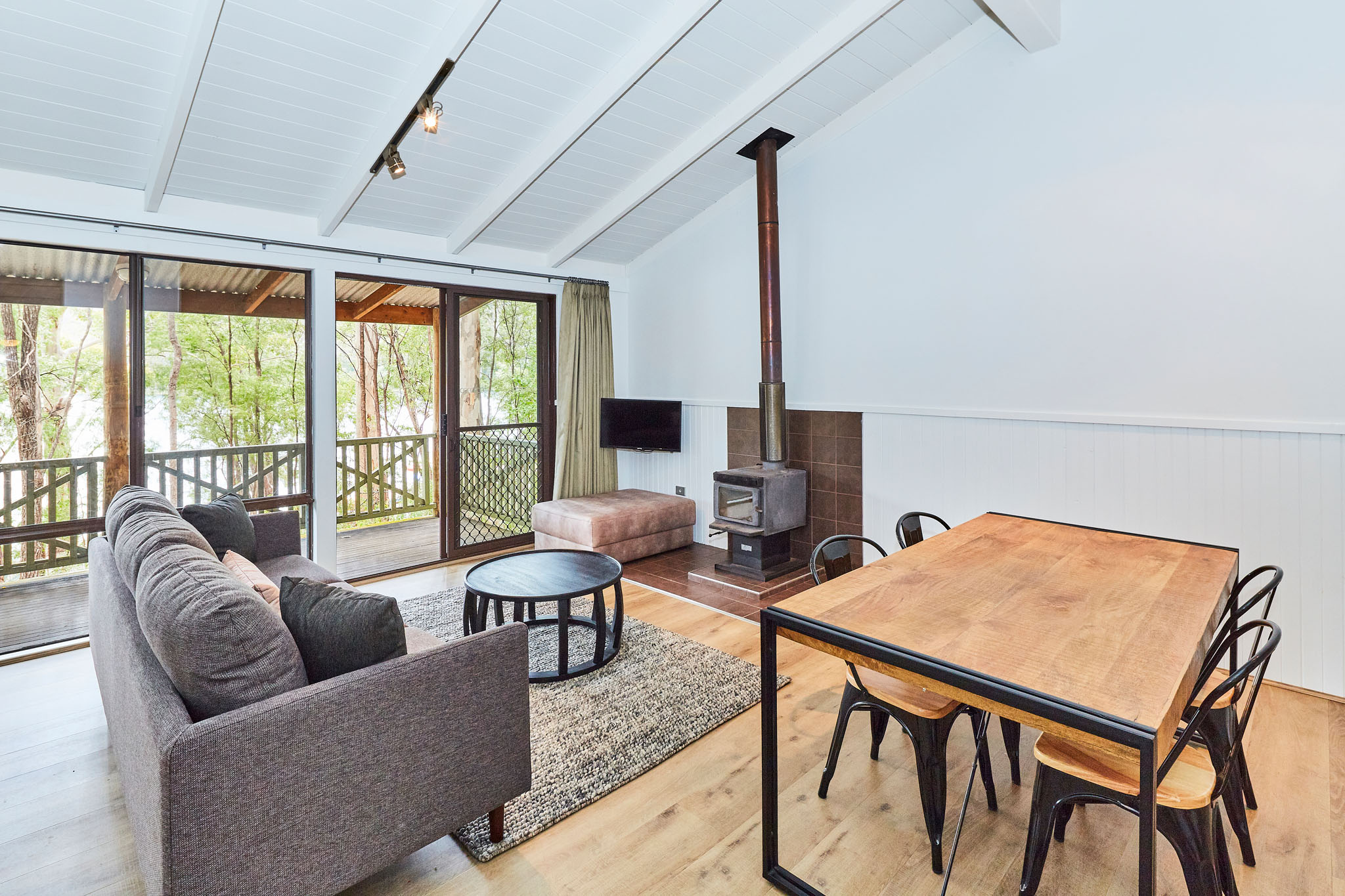 This Two Bedroom Chalet offers stunning forest views and a peaceful setting beneath the towering trees. This forest chalet contains a queen bed and two single beds, making it ideal for two couples or a family. Accommodation facilities include free Wi-Fi, a log fire with pre-chopped wood (winter only), kitchen with fridge, stovetop, and microwave, a bathroom and a lounge and dining area with a TV. Enjoy the views from your private balcony, complete with dining setting for alfresco meals.