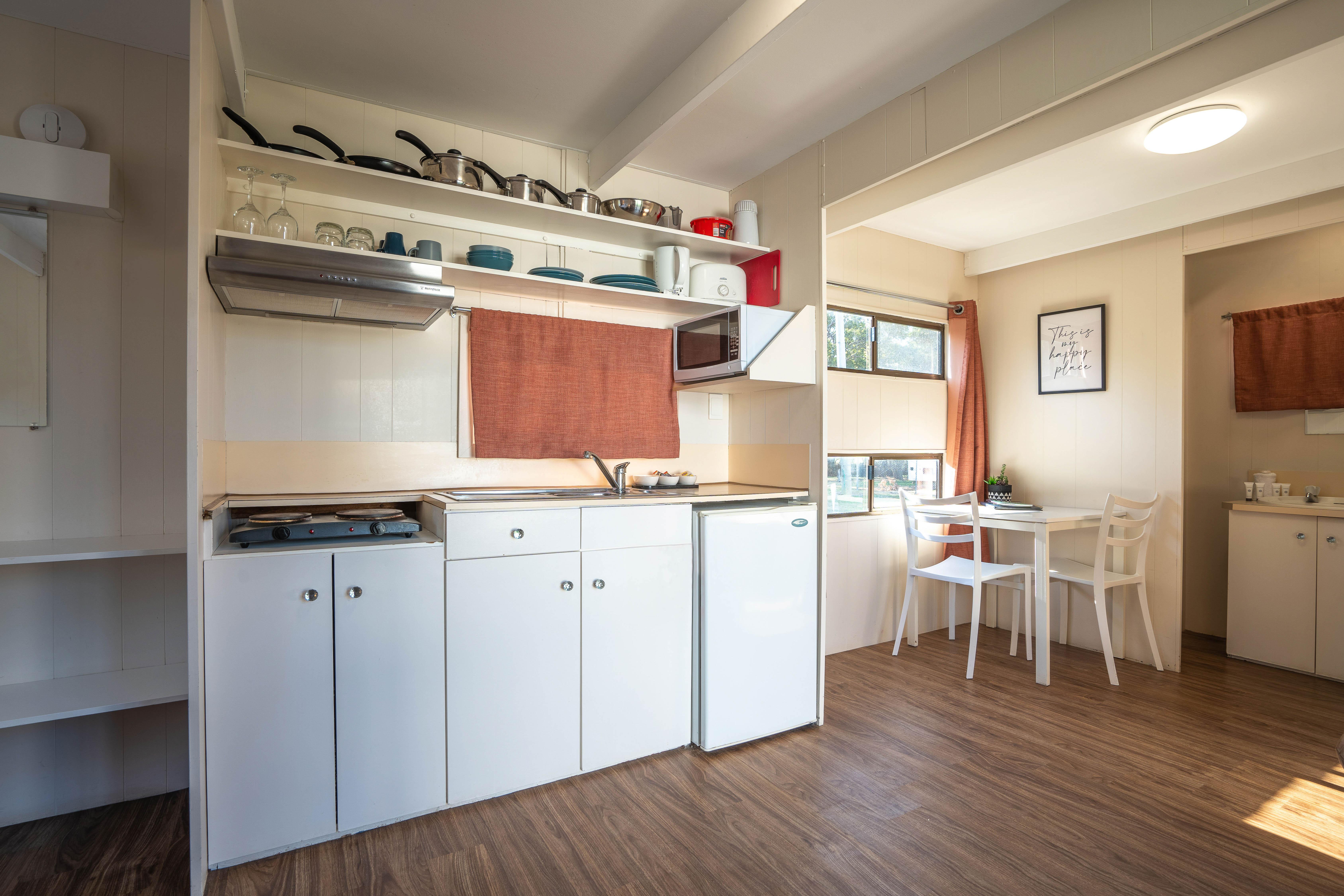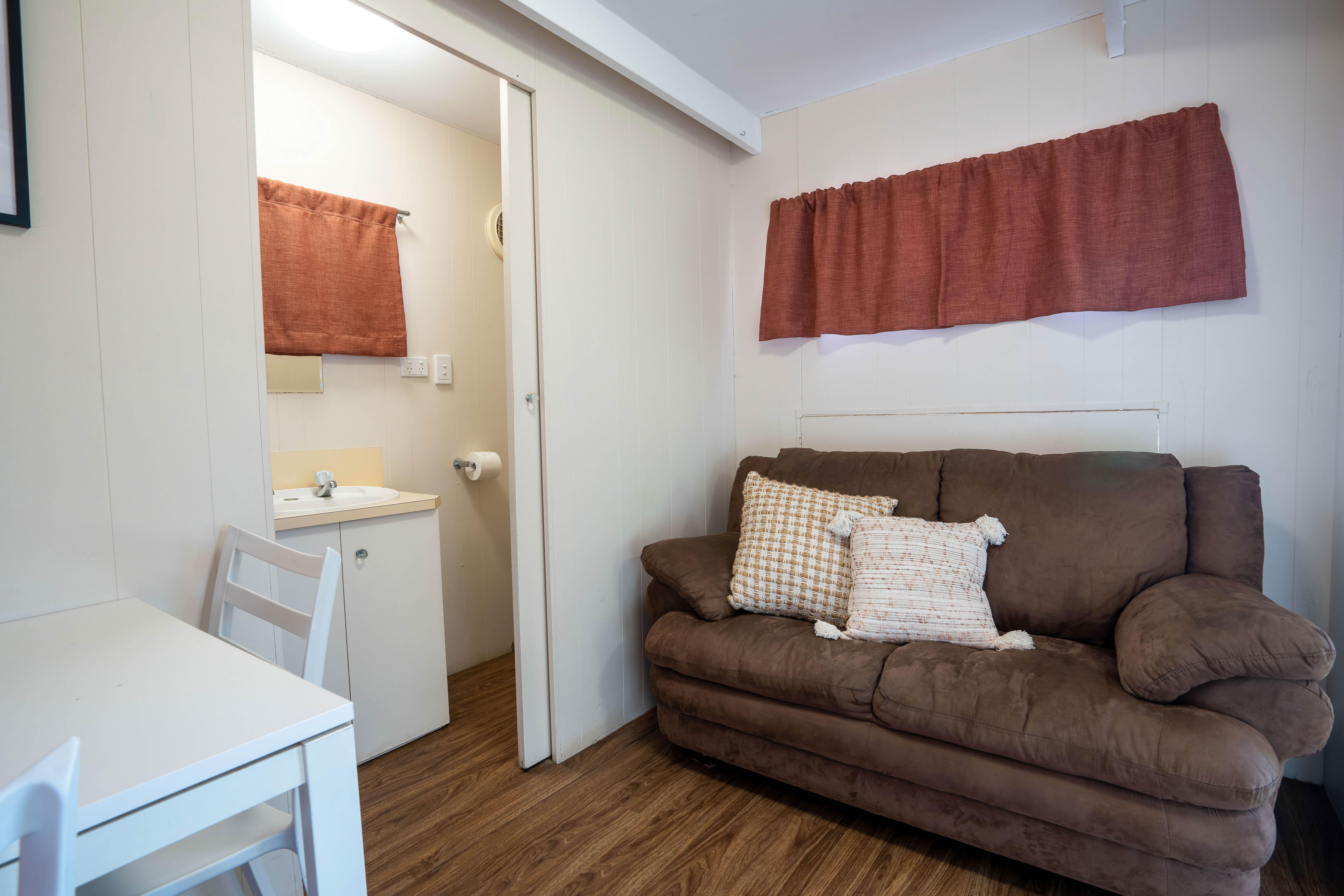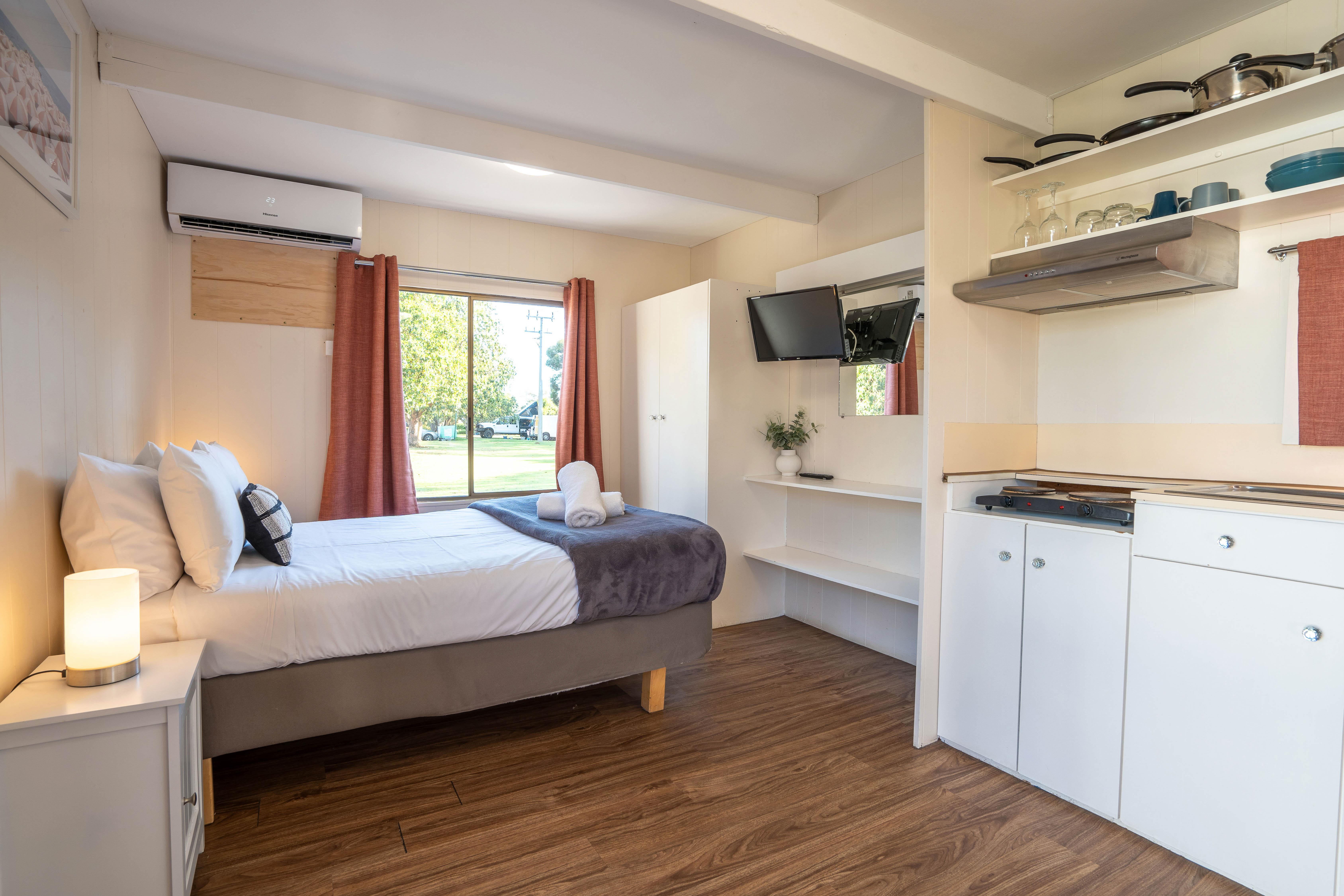 This self-contained, open-plan cabin is ideal for singles or couples seeking a cosy getaway. It includes a comfy queen bed, a kitchenette with a microwave and bar fridge, a dining table and chairs, a TV, reverse cycle air-conditioning, and a private ensuite. We provide all the essentials for a pleasant stay, including linen.