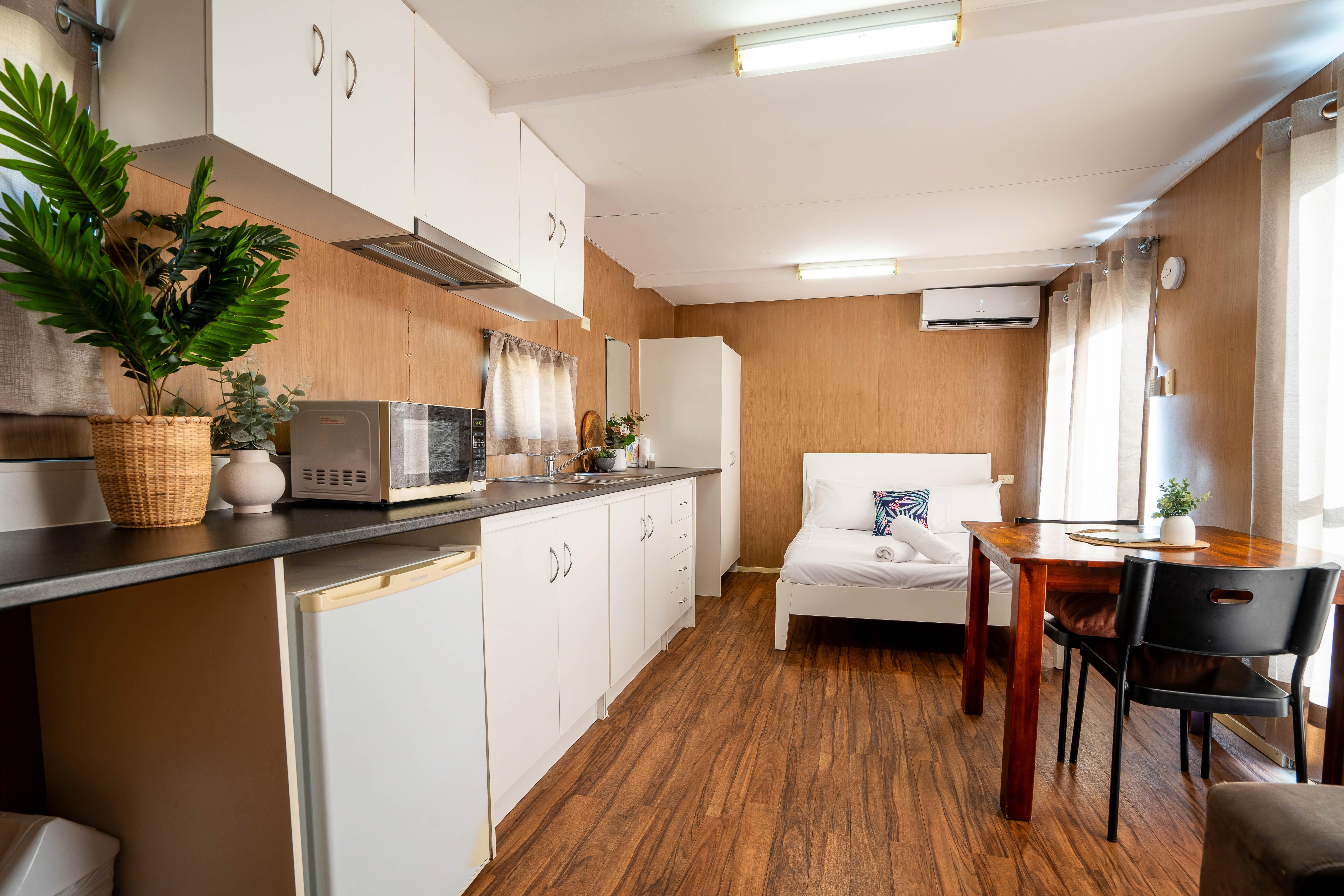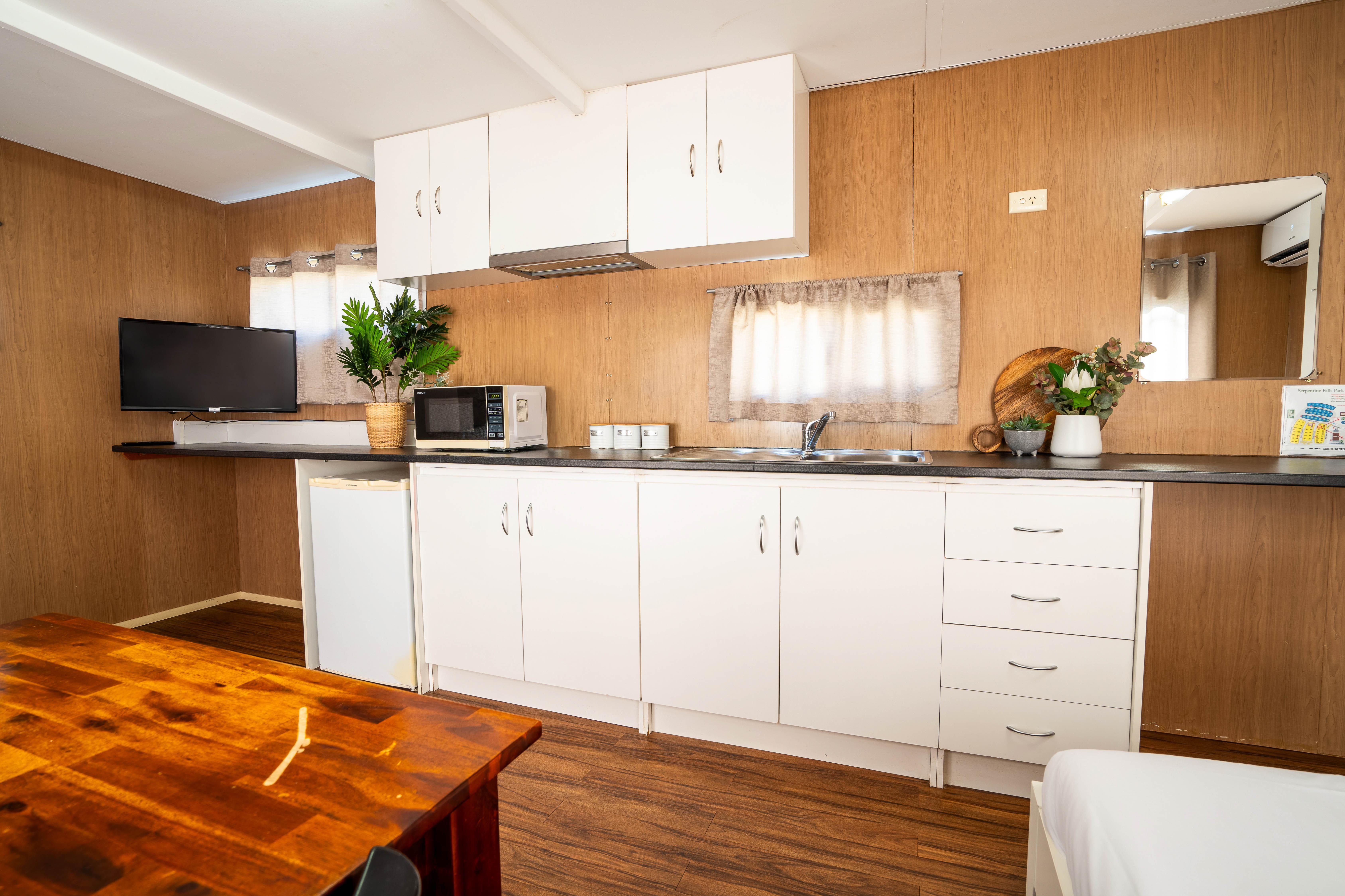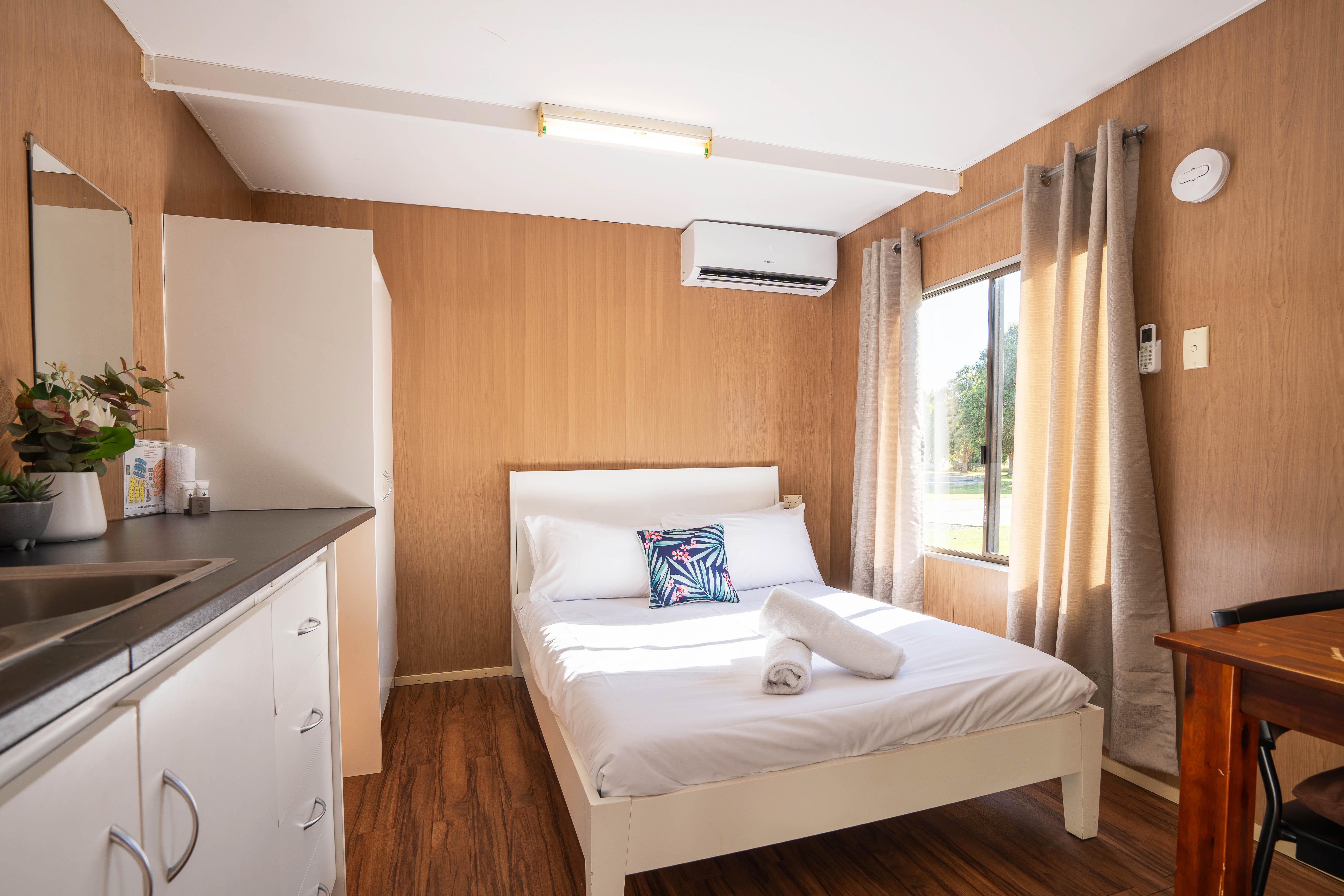 Our open-plan Budget Cabin is perfect for guests looking for comfortable, affordable accommodation. It features a cosy double bed, a small kitchenette with a microwave and bar fridge, a dining table and chairs, a TV, and reverse cycle air-conditioning.