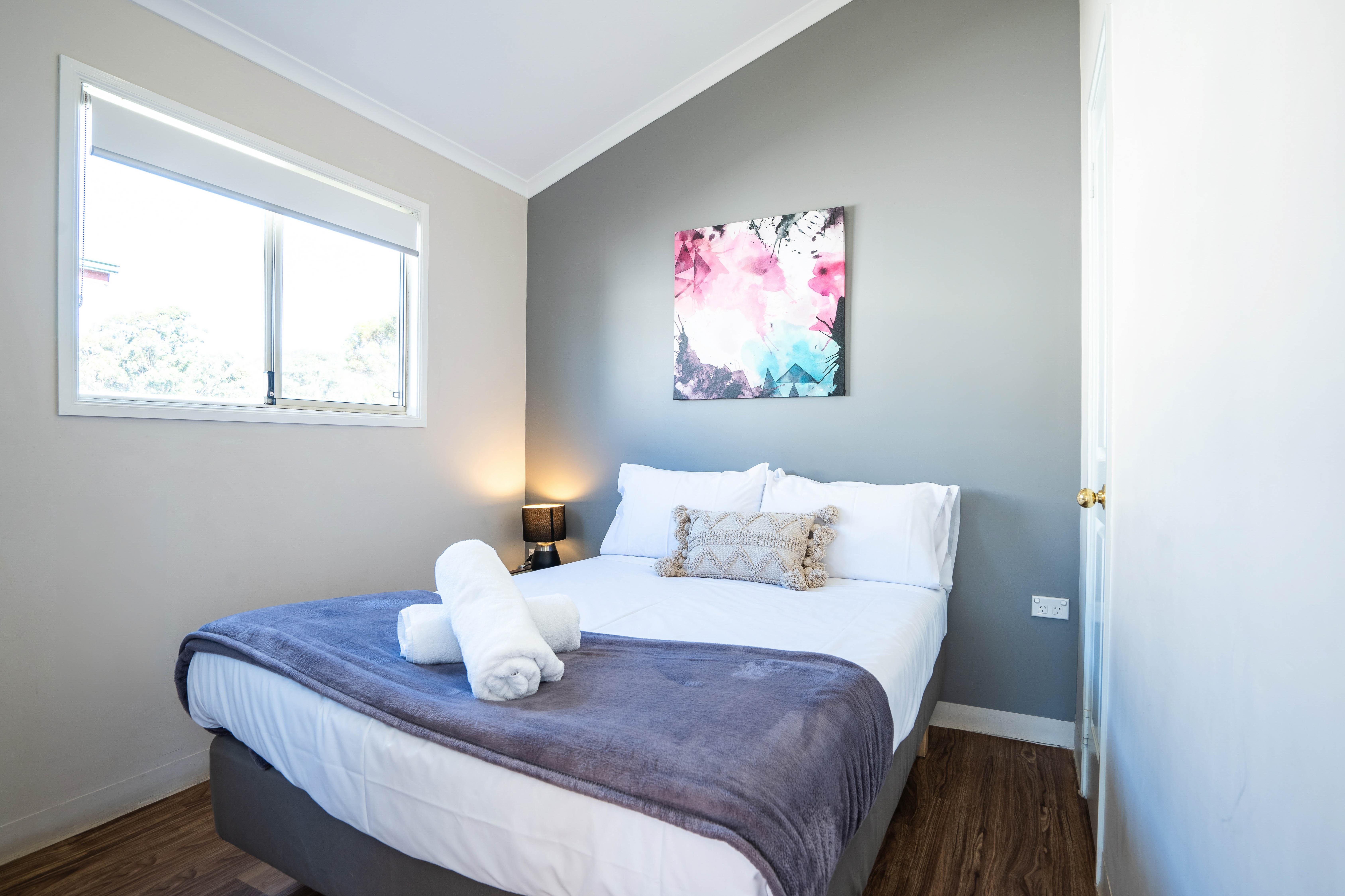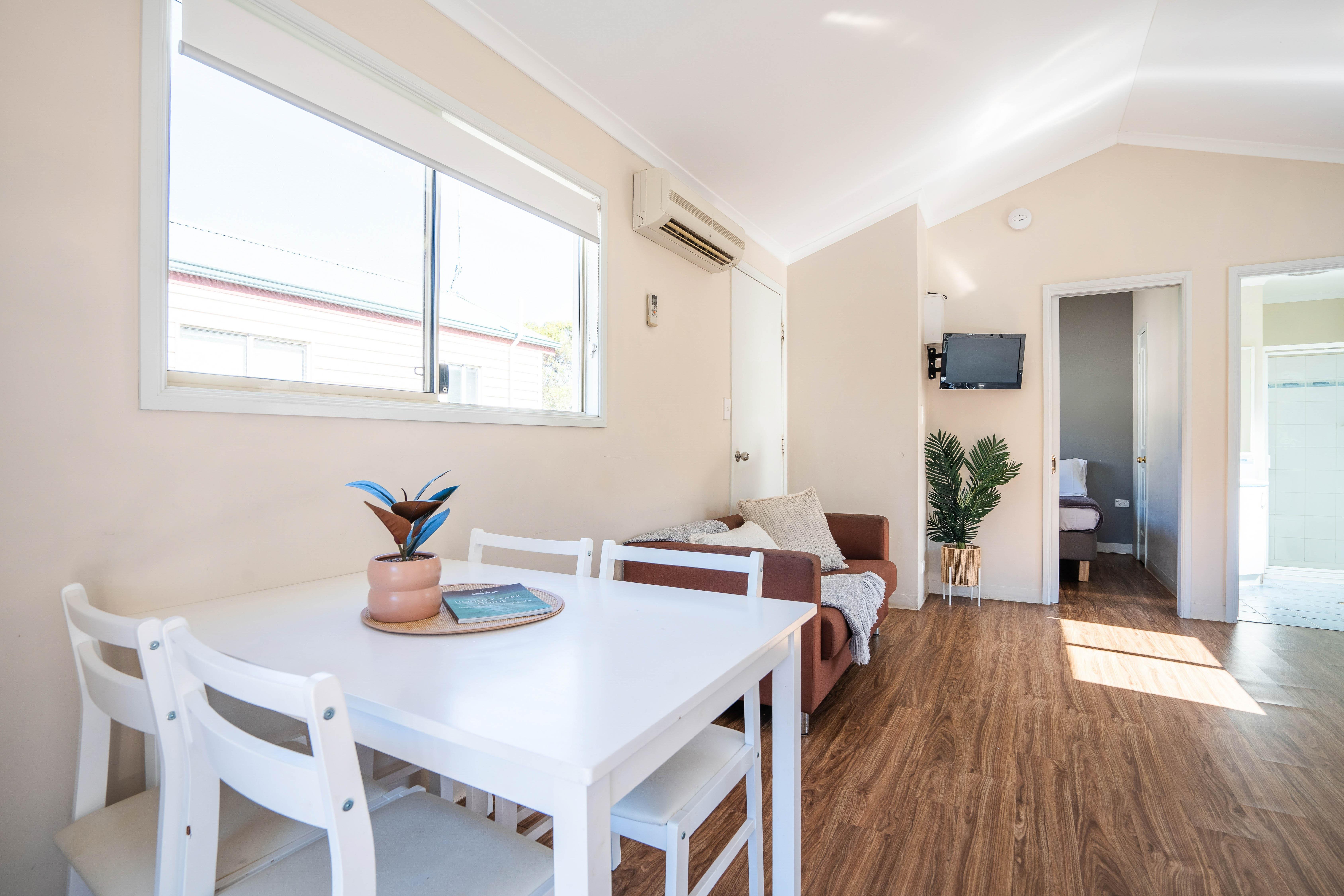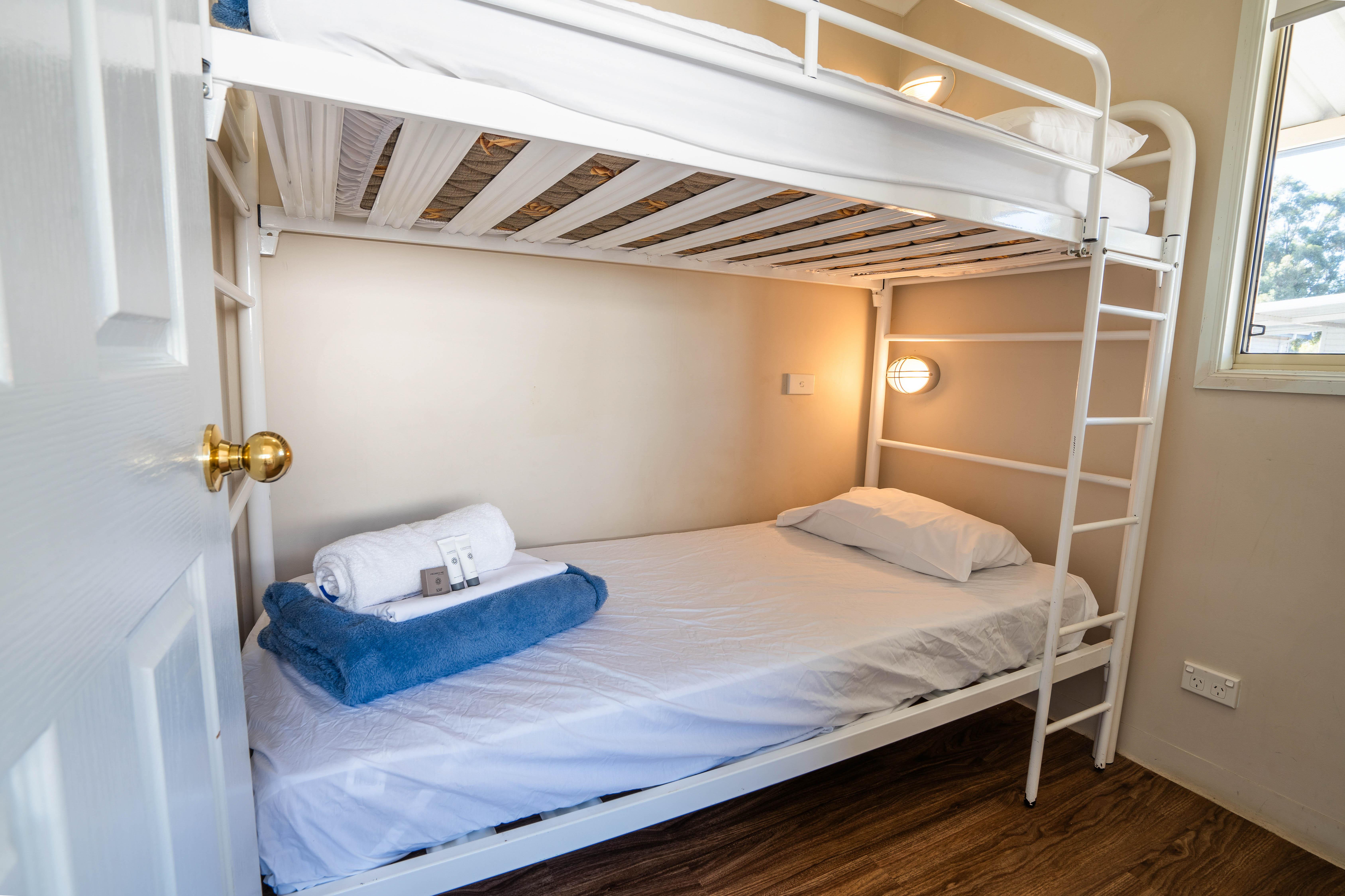 Perfect for families or small groups, this two bedroom cabin has a queen bed and a bunk bed to comfortably sleep 4 guests. It comes with a kitchenette featuring a microwave and bar fridge, a comfy sofa, TV, reverse cycle air-conditioning, a spacious ensuite, and a covered veranda for outdoor relaxation. Linen is provided.