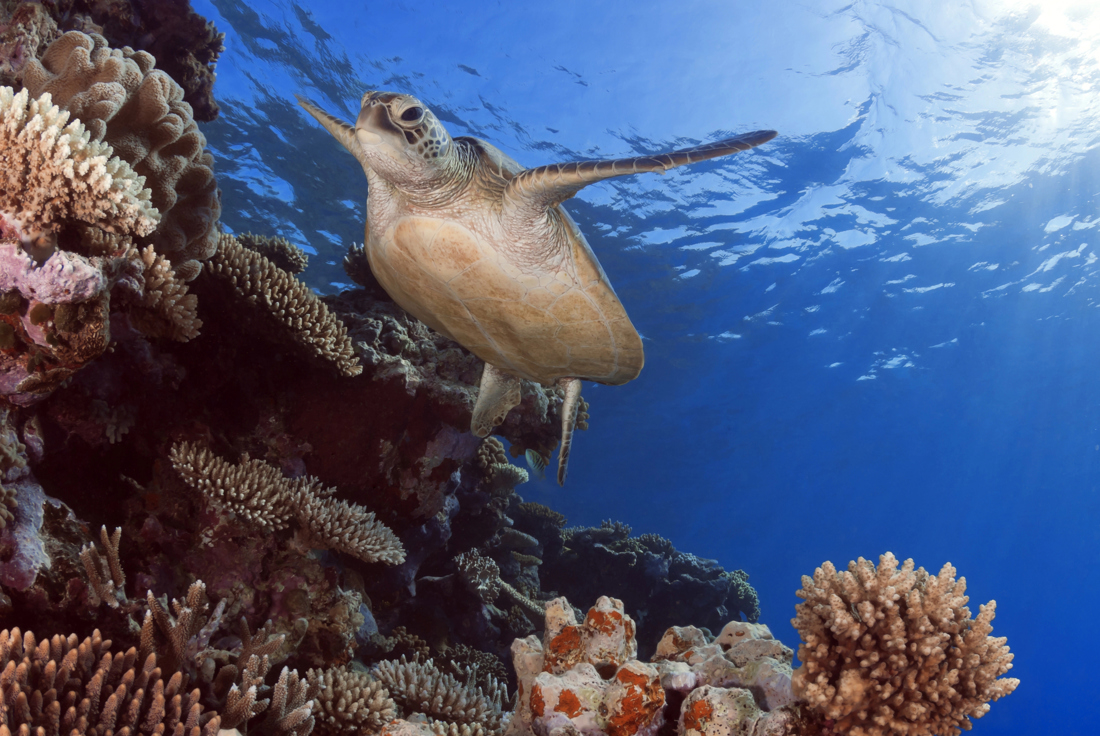 A Green Sea Turtle swimming along the majestic Great Barrier Reef, QLD